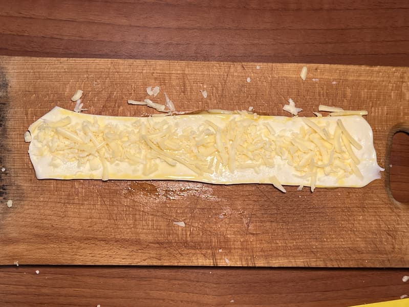 Каждую полосу хорошенько раскатали, смазали желтком и разместили сверху тертый сыр.