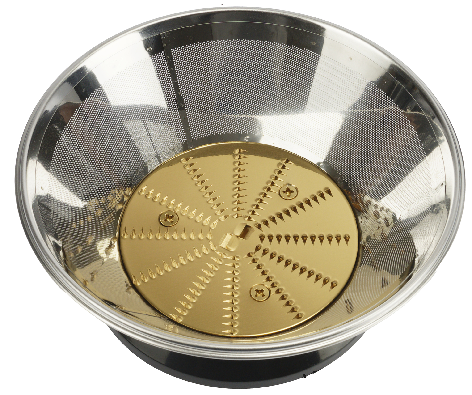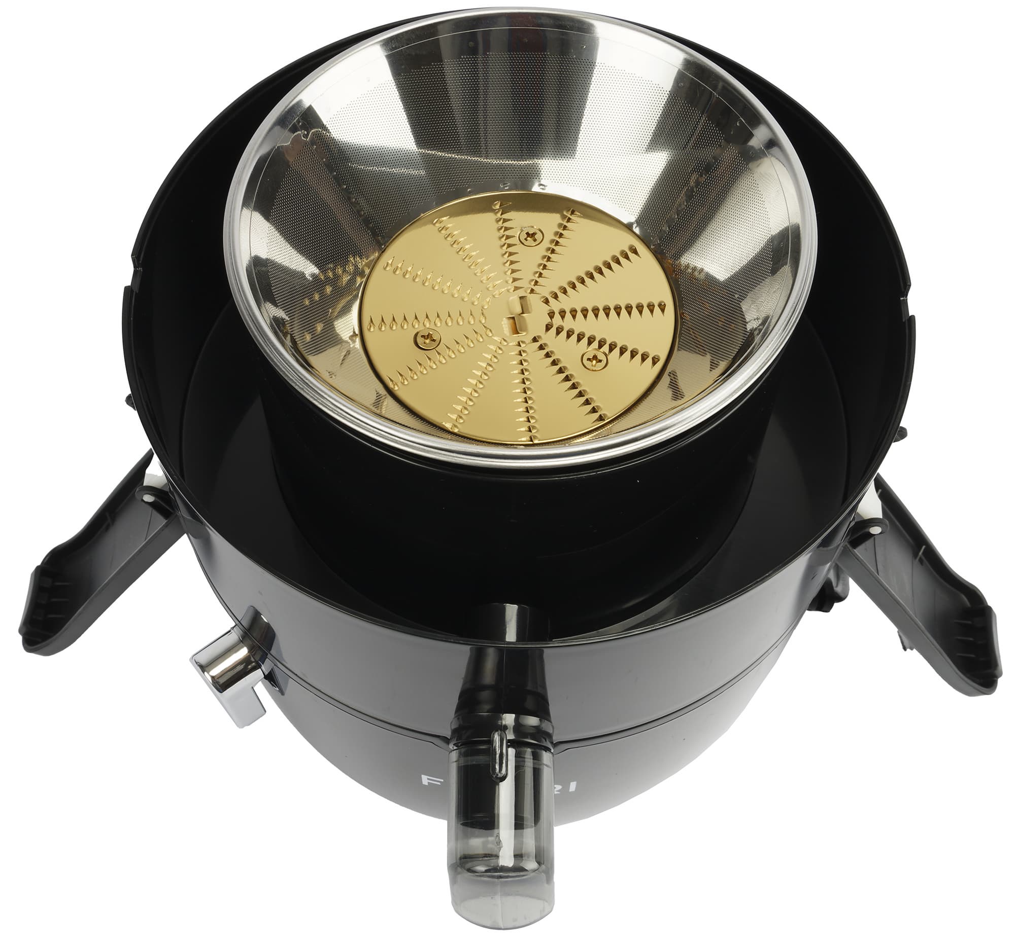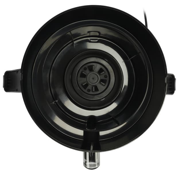 Сразу под крышкой располагается круглый съемный стальной фильтр-терка. На ноже внизу нанесено защитное покрытие из нитрида титана, которое имеет золотистый цвет. Покрытие должно не только защитить нож при длительной эксплуатации, но и также защитить сок от окисления. Нижняя часть конструкции сделана из пластика и она плотно надевается на разъем в моторном блоке.