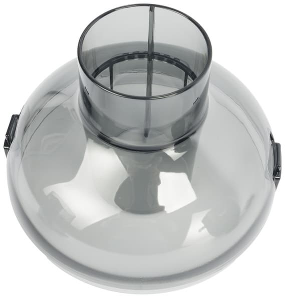 Загрузочная горловина (она же — крышка соковыжималки) сделана из темного полупрозрачного пластика. В горловине крышки находится объемный выступ, который должен совпадать с пазом на толкателе, чтобы тот беспрепятственно мог попасть внутрь.