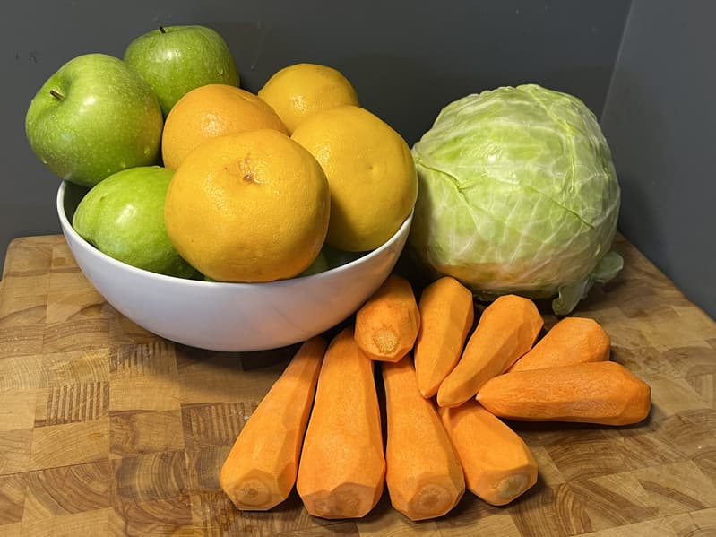 Мы взяли несколько крупных морковин, почистили и использовали при отжиме целиком.