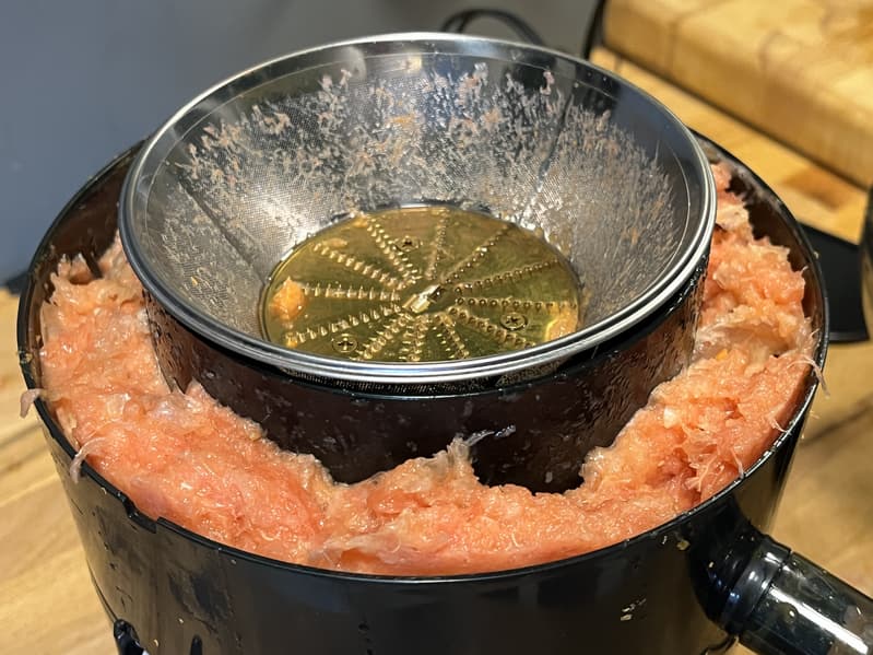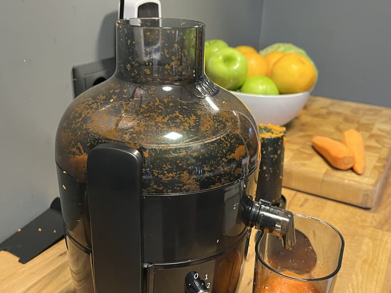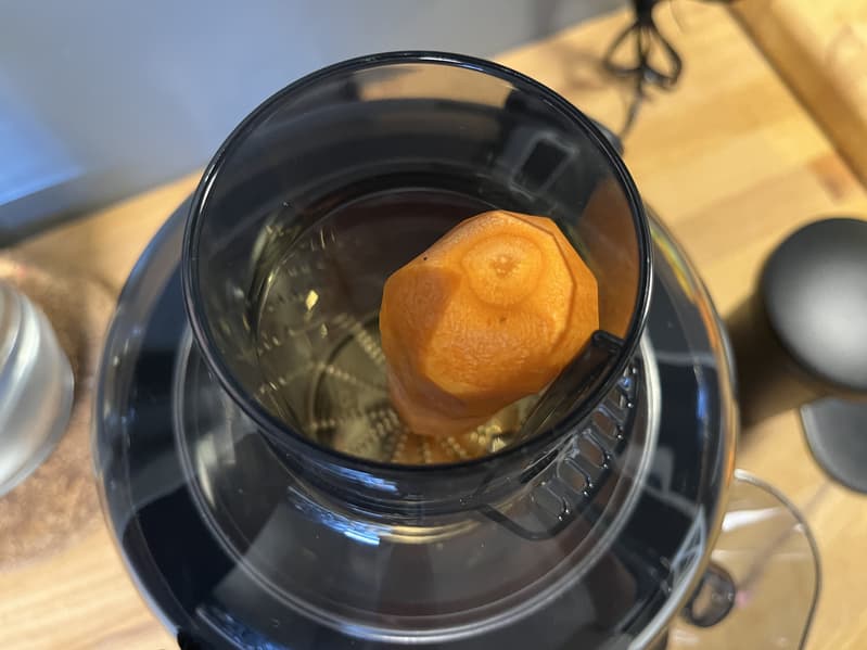 Контейнер для жмыха наполняется достаточно быстро. При обработке килограмма моркови нам пришлось делать паузу, чтобы вынимать накопившиеся отходы, освобождая место для следующей порции. Поэтому при обработке большого количество продуктов могут возникнуть сложности.