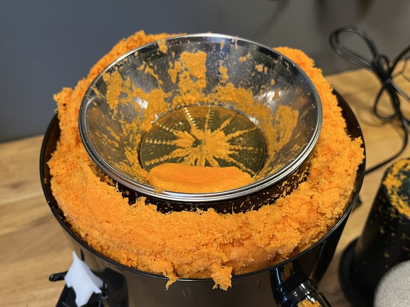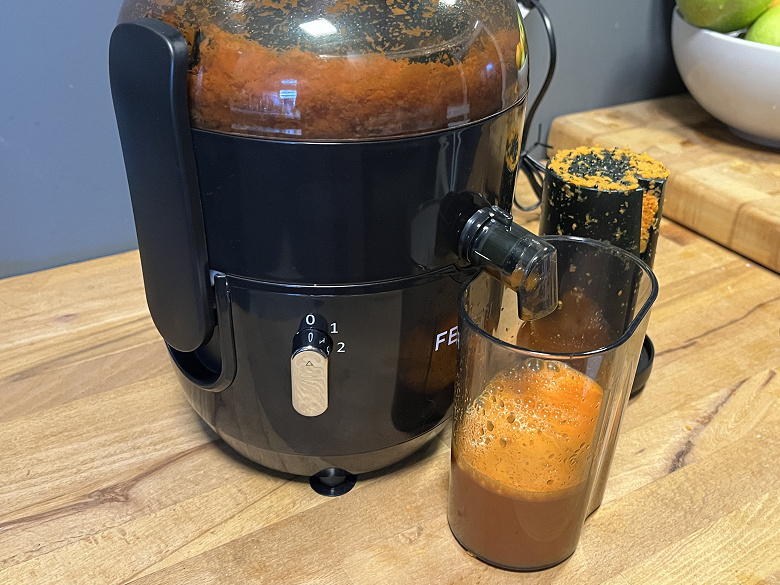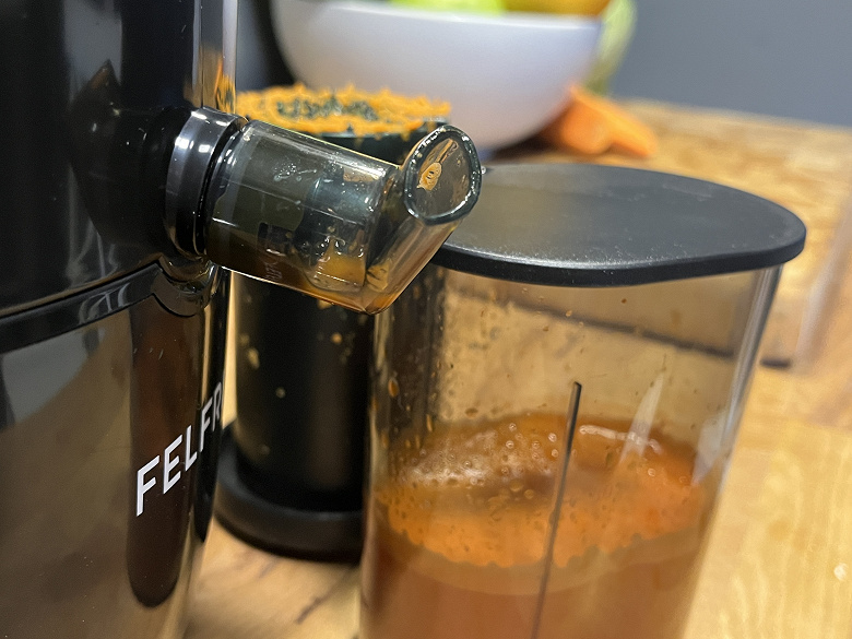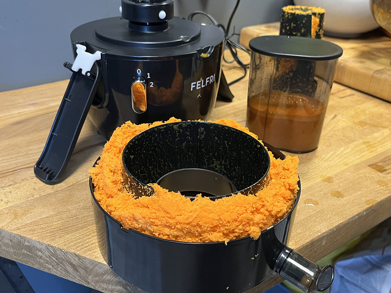 Останавливаться, впрочем нам пришлось лишь дважды. Первый раз — когда контейнер для жмыха переполнился, а второй — когда кусок моркови натерся до толщины 4 мм и стал застревать между теркой и краем горловины.