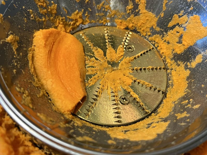 Этот кусок измельчить так и не удалось, потому что толкатель до него не доставал и при стирании до 2 мм терка просто катала его по кругу. Но в остальном тест удался, сок мы получили в достаточном количестве и быстро.