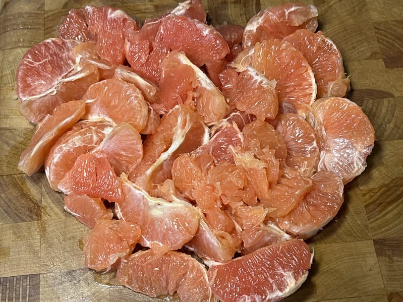 Для теста мы приобрели пять некрупных грейпфрутов, которые после очистки слегка превысили наш классический тестовый вес — получилось на 92 грамма больше необходимого килограмма. Удалив пару долек, мы получили нужный вес.