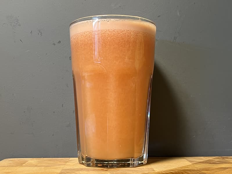 Сок выжимается очень быстро. С мягкими фруктами, такими как грейпфрут, соковыжималка справляется молниеносно, а с твердыми может немного забуксовать в процессе и тогда потребуется надавить на толкатель посильнее (хотя производитель просит не оказывать давление на толкатель более чем в килограмм). Сок получается непрозрачный, часто с пеной, но фрагментов фруктов и овощей мы в нем не обнаружили.
