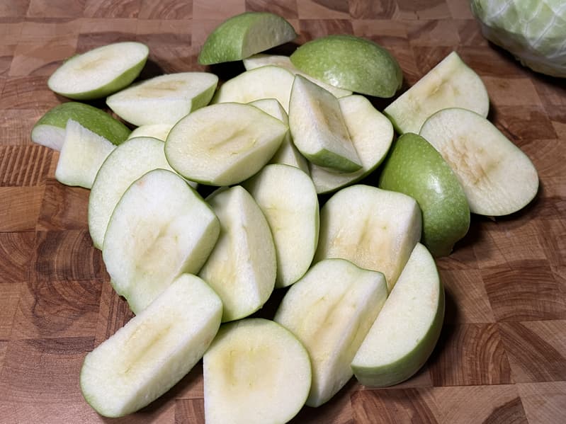 Мы нарезали яблоки сорта «Гренни Смит» на крупные кусочки и половинки, убрав из них сердцевину и взвесив ровно 1 килограмм.