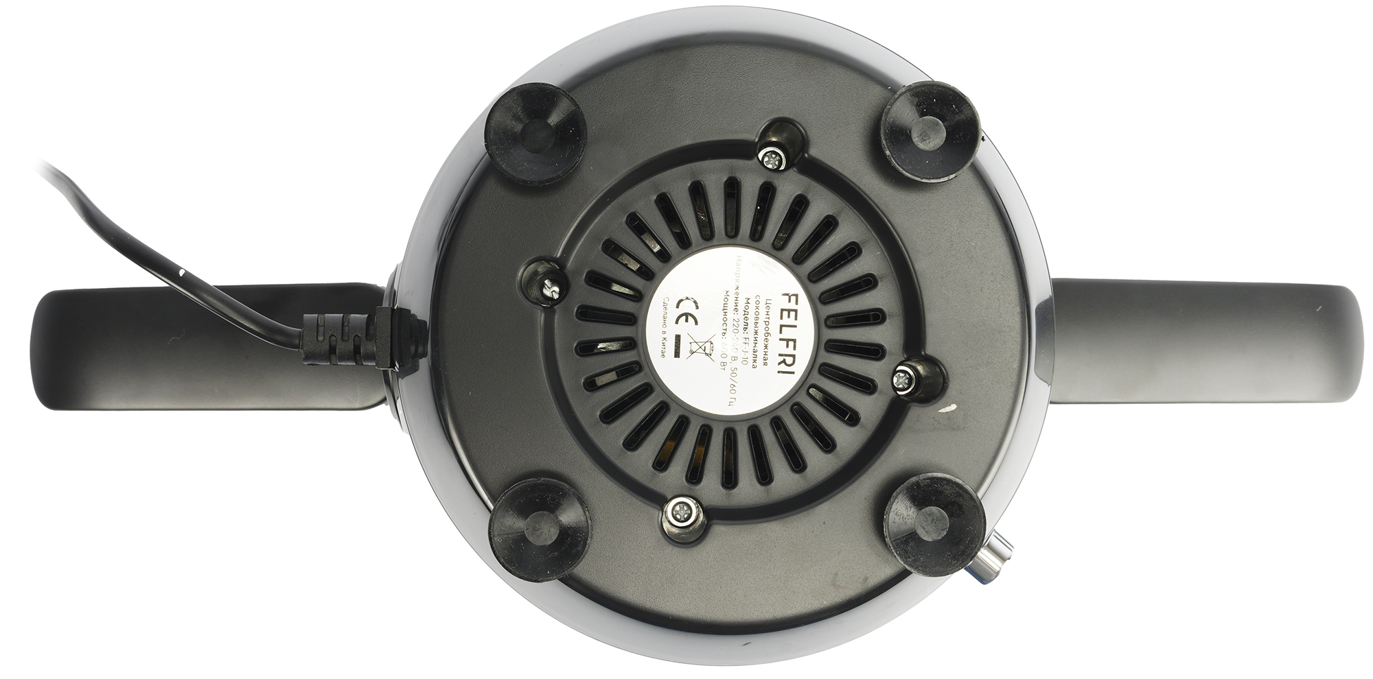На дне моторного блока мы видим круговые вентиляционные отверстия, четыре прорезиненных ножки-присоски и круглый шильдик по центру с краткой технической информацией.