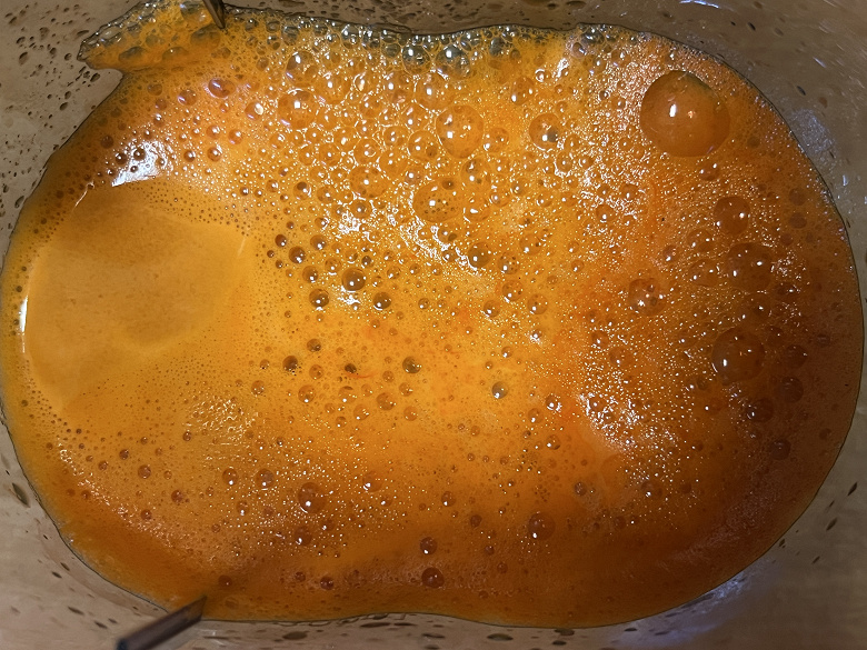 У нас получился целый большой стакан яркого и ароматного сока с большим количеством пенки.