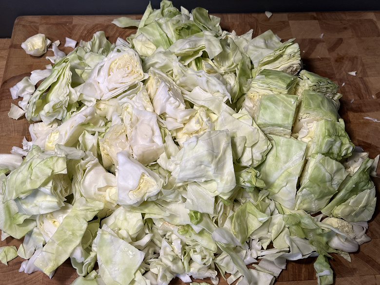 Для второго теста мы крупно нарезали и отмерили килограмм белокочанной капусты.