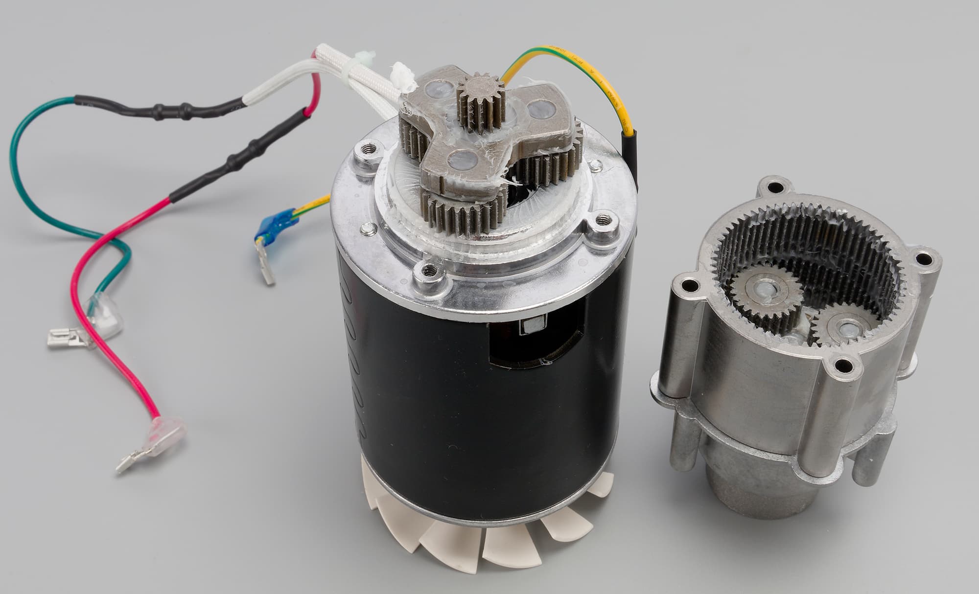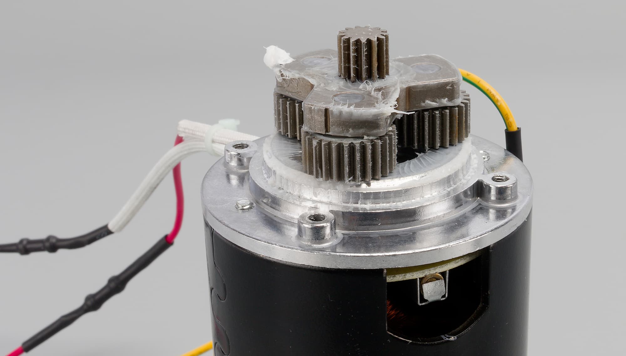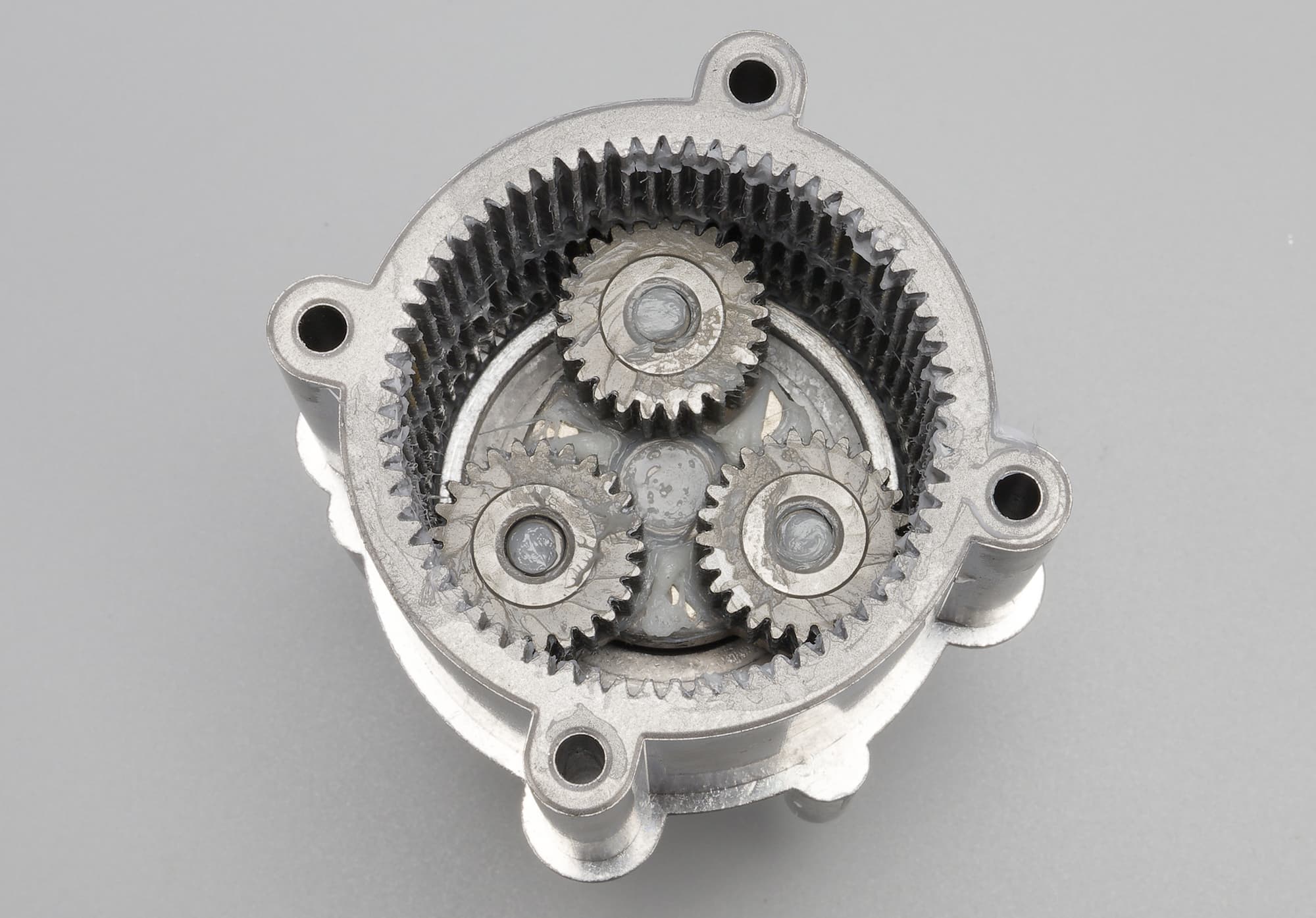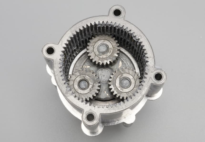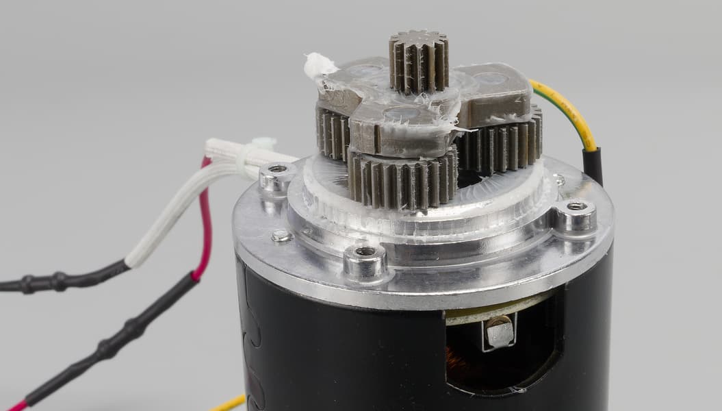 Солнечная и три сателлитные шестеренки сделаны из металла. Они закреплены на моторе и заполнены большим количеством густой смазки.