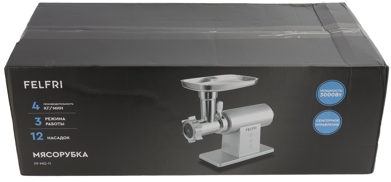 Мясорубка поставляется в крупной коробке, оформленной в фирменной стилистике бренда. На матовом черном фоне мы видим фотографию устройства в основной сборке, наименование бренда и модели и 3 основные характеристики.