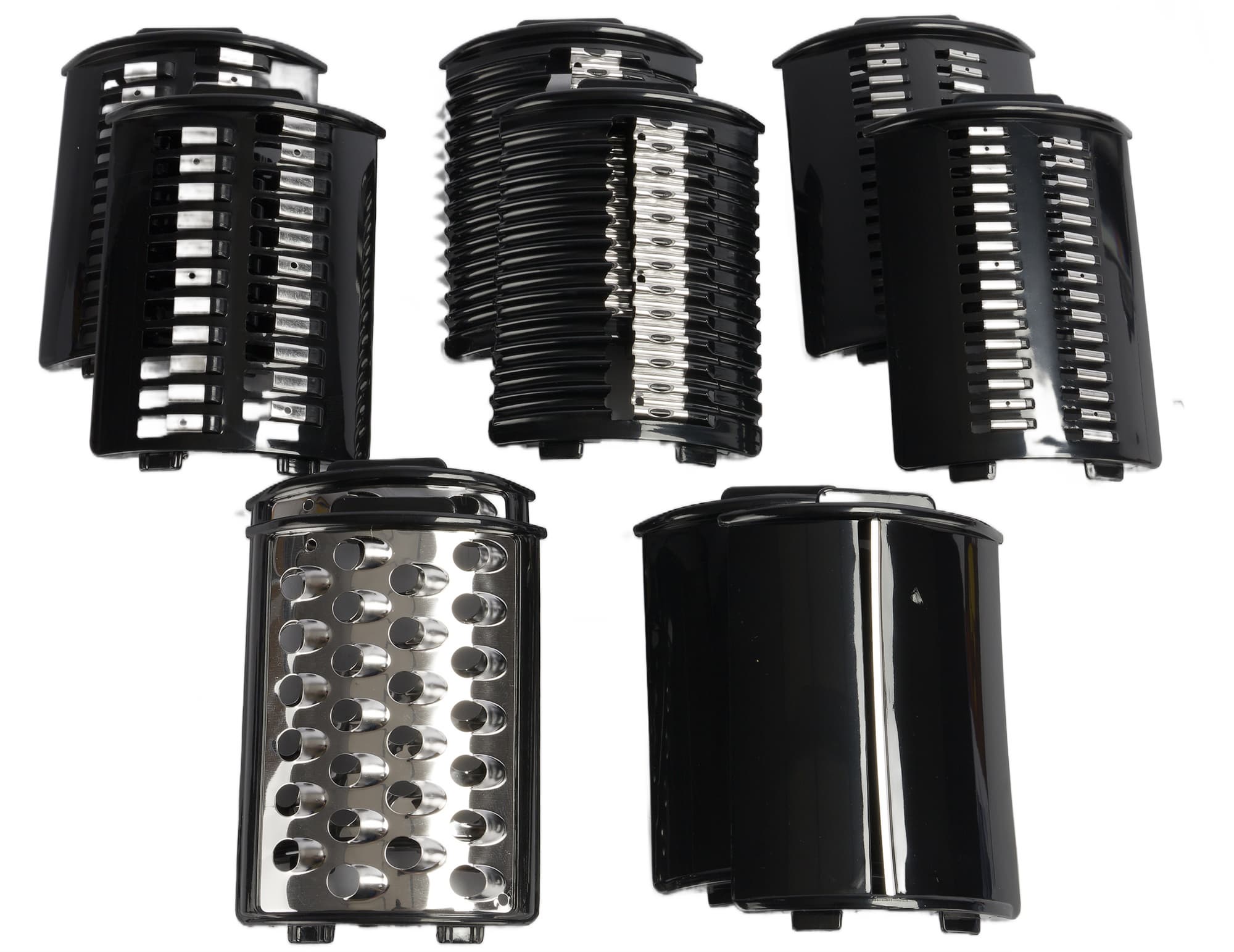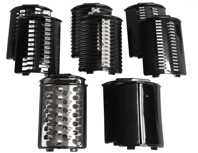 Режущие насадки представляют собой закругленные пластиковые основания по форме стенок «стакана» с 1-4 рядами лезвий. Всего в комплекте 5 пар насадок: шинковка, крупная и мелкая терки, насадка для драников и терка для волнистой нарезки.
