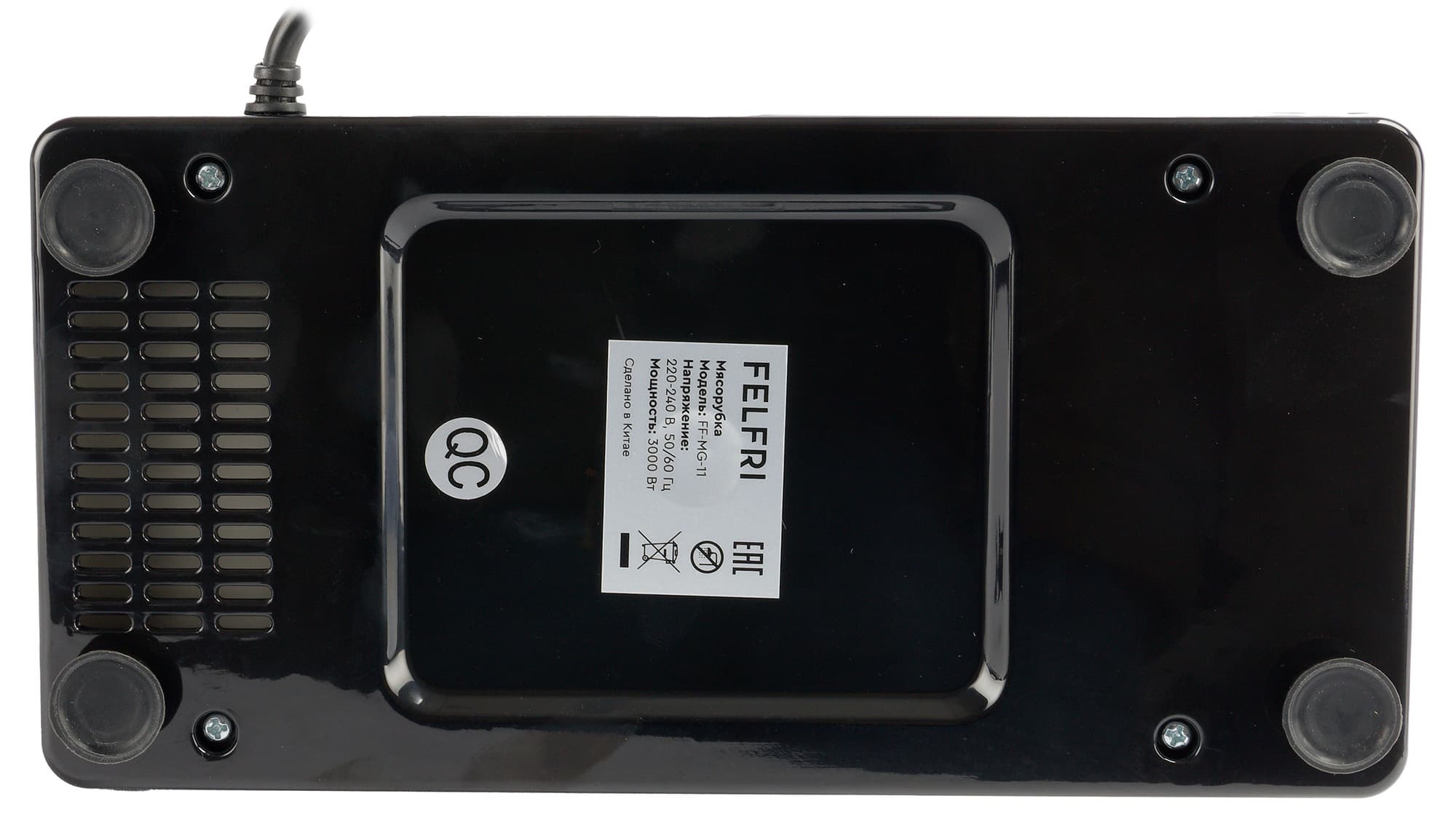 Дно корпуса оборудовано четырьмя резиновыми ножками с присосками, назначение которых — гасить вибрации при работе и надежно фиксировать устройство на рабочей поверхности. Здесь же мы видим множество технических отверстий и наклейку с краткой технической информацией о приборе.