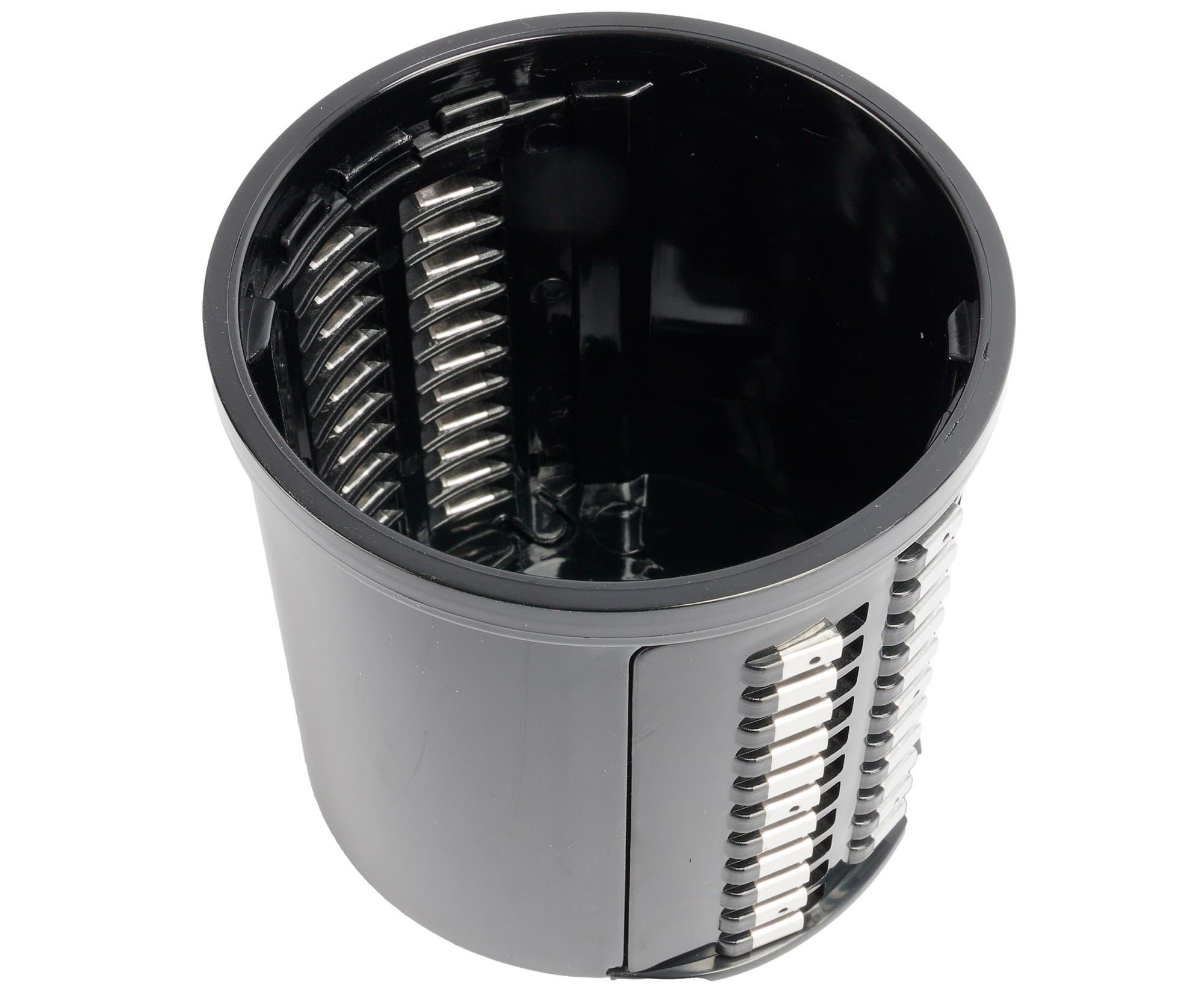 Основание терки представляет собой пластиковый «стакан» с двумя отверстиями для установки комплектов лезвий, вставляющийся в блок овощерезки.