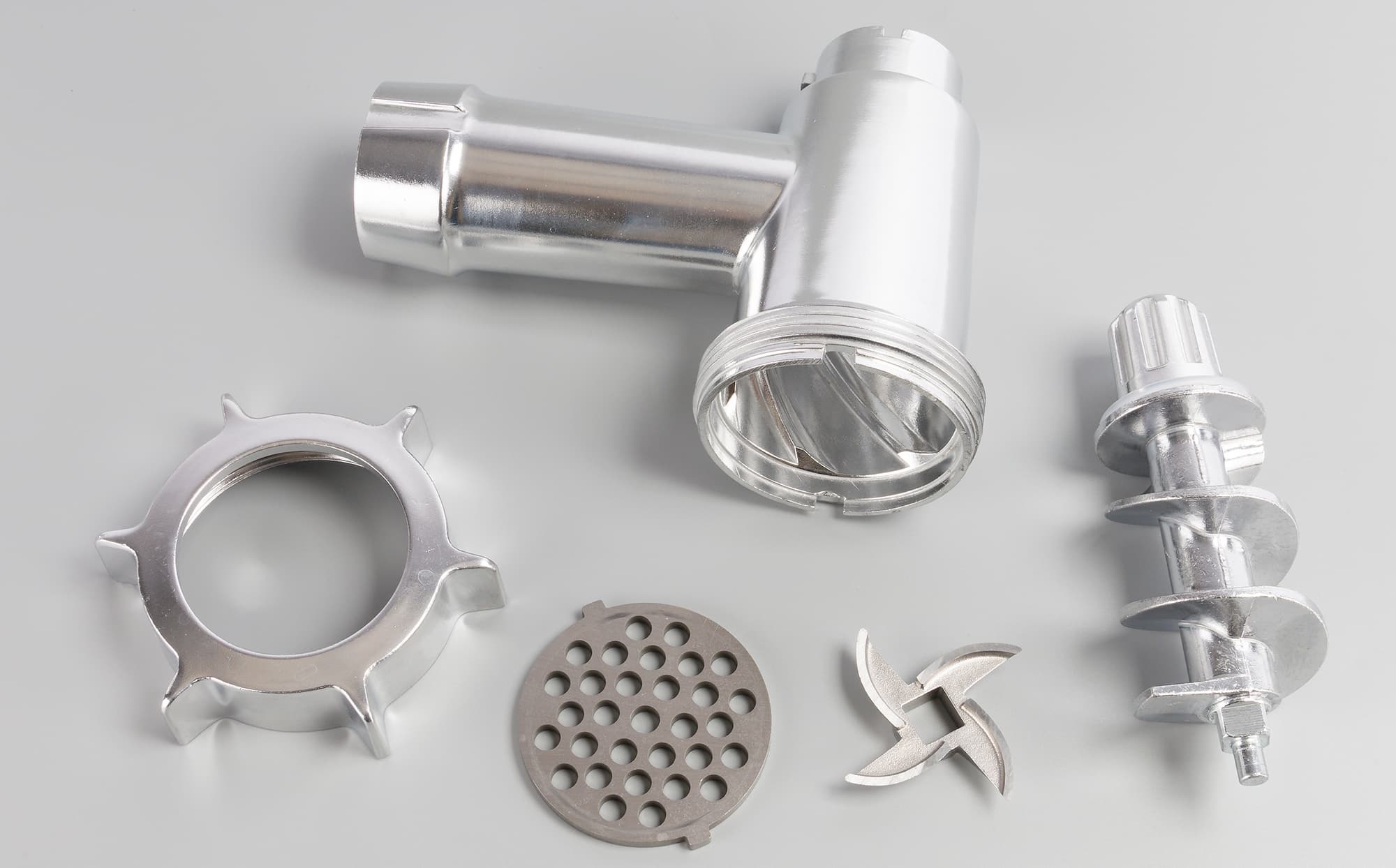 Корпус мясорубки выглядит стандартно: горловина, кольцевая гайка и шнек из алюминиевого сплава, нож и решетки — стальные. Диаметр горловины — 5 см, высота — 10,5 см.