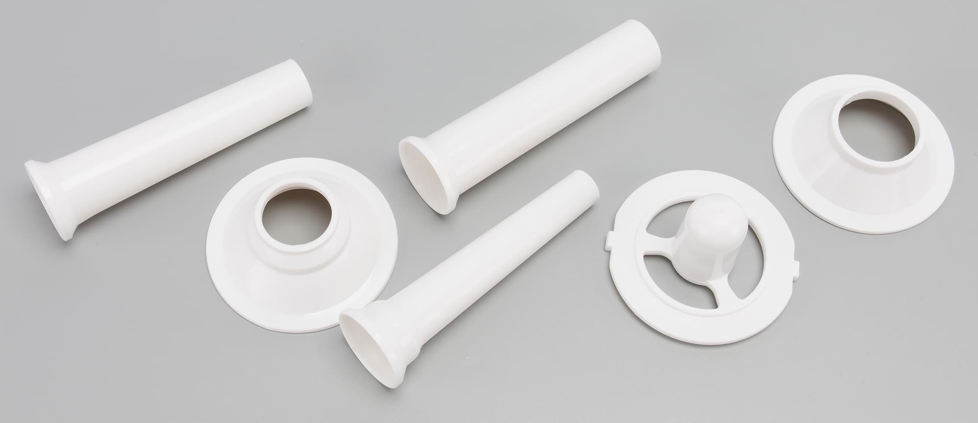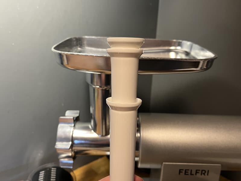 Толкатель пластиковый, как и аксессуары: насадки для изготовления колбас и кеббе. Корпус толкателя одновременно служит и контейнером для хранения мелких деталей.
