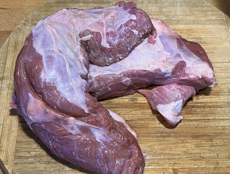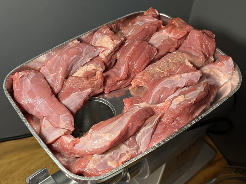 Для тестирования мясорубки мы взяли свиной окорок, срезали бо́льшую часть прожилок и порезали его на длинные куски, ориентируясь на диаметр горловины.