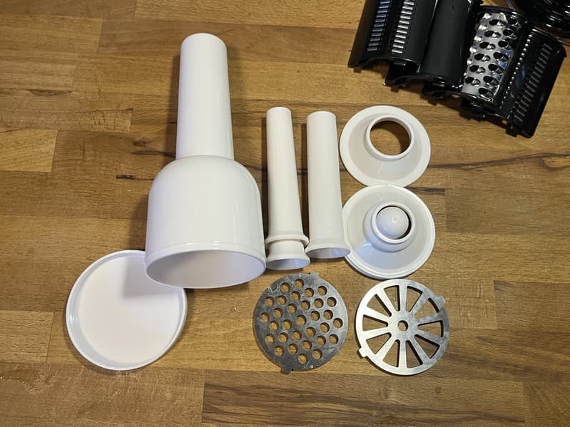 Некоторые вопросы вызывает комплектация: аксессуары для мясорубки не помещаются в контейнер-толкатель, как это обычно бывает. Мы потратили 10 минут на тщетные попытки сложить комплектующие внутрь толкателя в той или иной комбинации. Есть ощущение, что одна из насадок для колбас — нестандартной толщины, так как две размером поменьше без проблем вставляются друг в друга и без нее все складывается внутрь и закрывается крышкой без проблем.