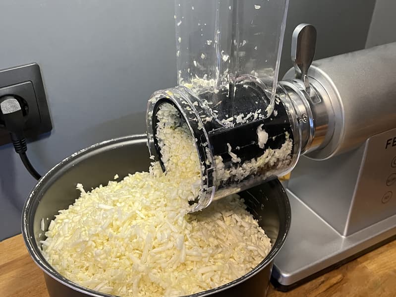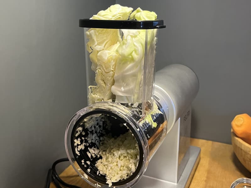 Процесс шел быстро и без проблем. На целый кочан капусты ушло всего 2 минуты с небольшим. И что самое приятное — не осталось ни единого непереработанного или застрявшего кусочка.