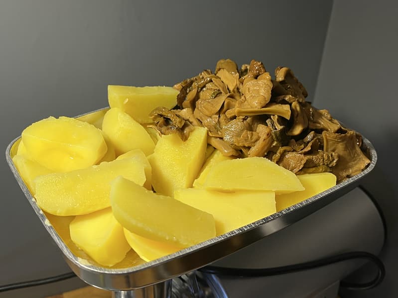 Качество фарша в целом нормальное, и с мягкими и подготовленными продуктами мясорубка работает очень уверенно. Вареный картофель и отваренные сушеные грибы были переработаны быстро и без усилий — пюре для начинки вареников получилось однородным и качественным, без комков.