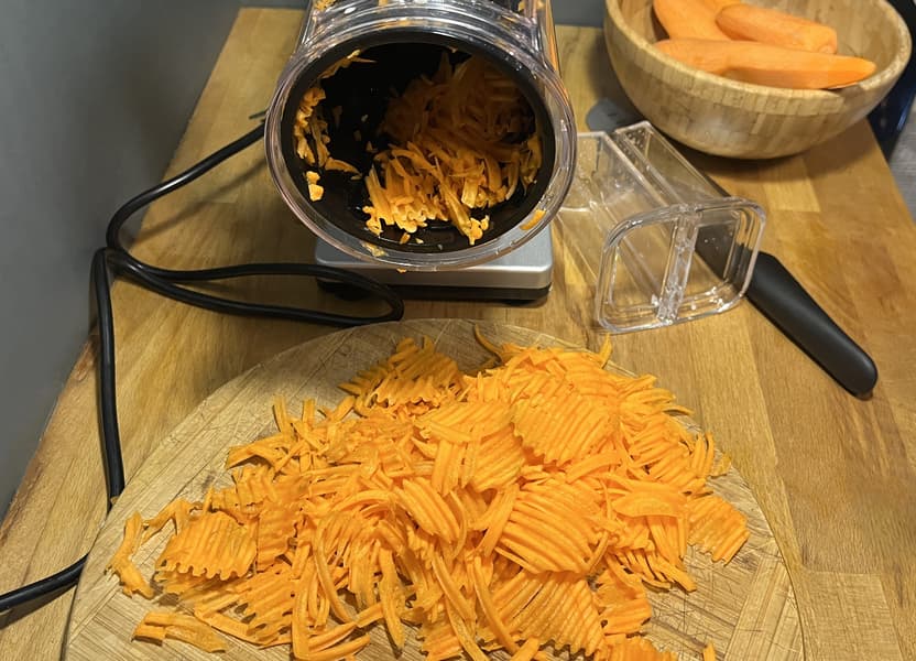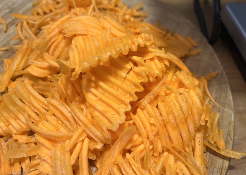И в последнюю очередь проверили рифленые лезвия, получив с помощью них морковные чипсы. Тут, правда, кусочки получились разными: часть крупными, как надо, а часть мелкими — так овощерезка справилась с остатками моркови в загрузочном отверстии.