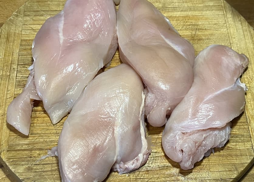 Для следующего фарша мы взяли куриное филе грудки, которое также нарезали крупными длинными кусками.
