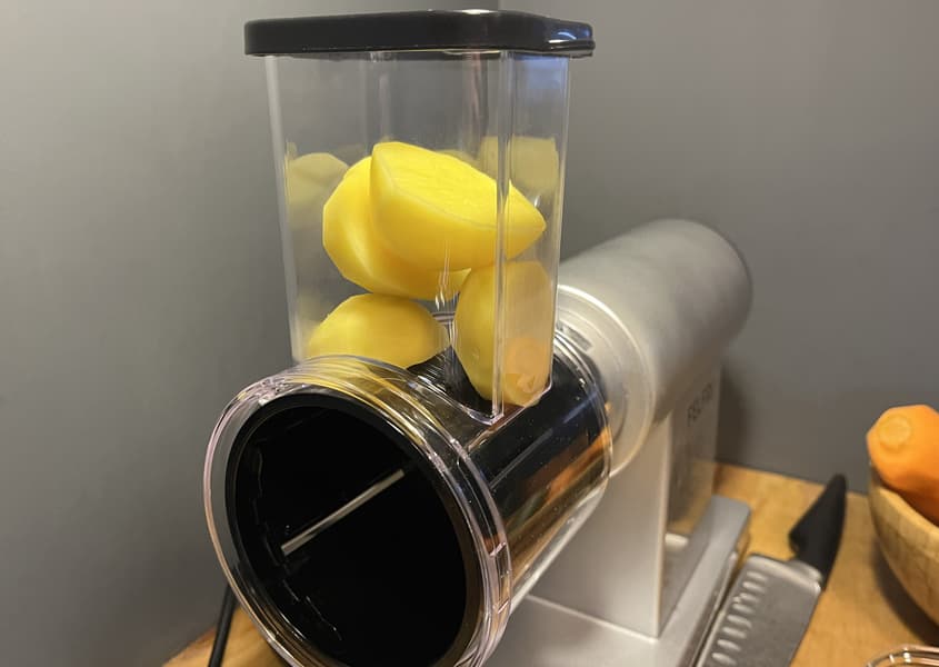 Прибор без труда переработал твердый картофель и не оставил ничего в загрузочной горловине. Кусочки получились тонкими и идентичными.