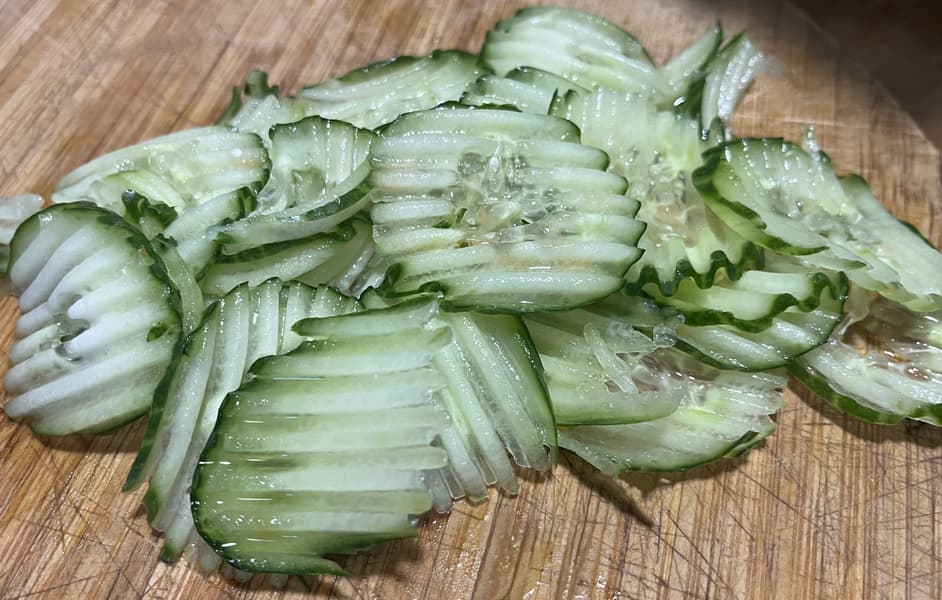 В качестве дополнительной проверки рифленых лезвий мы взяли огурец, чья консистенция позволила прибору нарезать все кусочки почти одинаковыми, не давая мелких отходов.