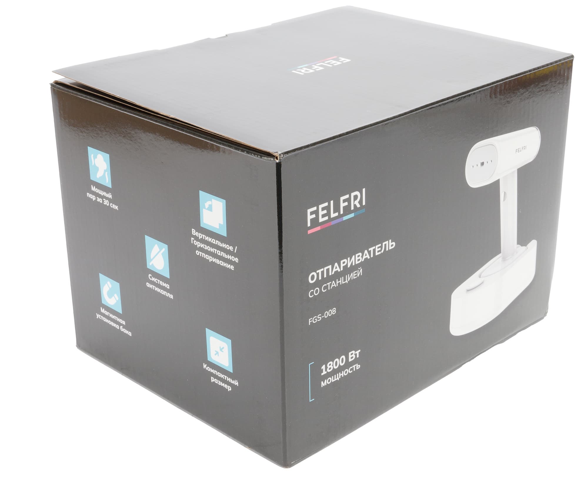 Отпариватель Felfri FGS-008 прибыл к нам на тестирование упакованным сразу в две коробки. Внешняя, из простого коричневого картона содержит краткую информацию о приборе, его схематическое изображение, данные производителя и транспортировочные значки. Внутри находилась коробка с полноцветной печатью, оформленная в фирменном стиле компании. На черном фоне — крупные фотографии устройства, описание главных преимуществ модели, ее полное наименование и уровень мощности.