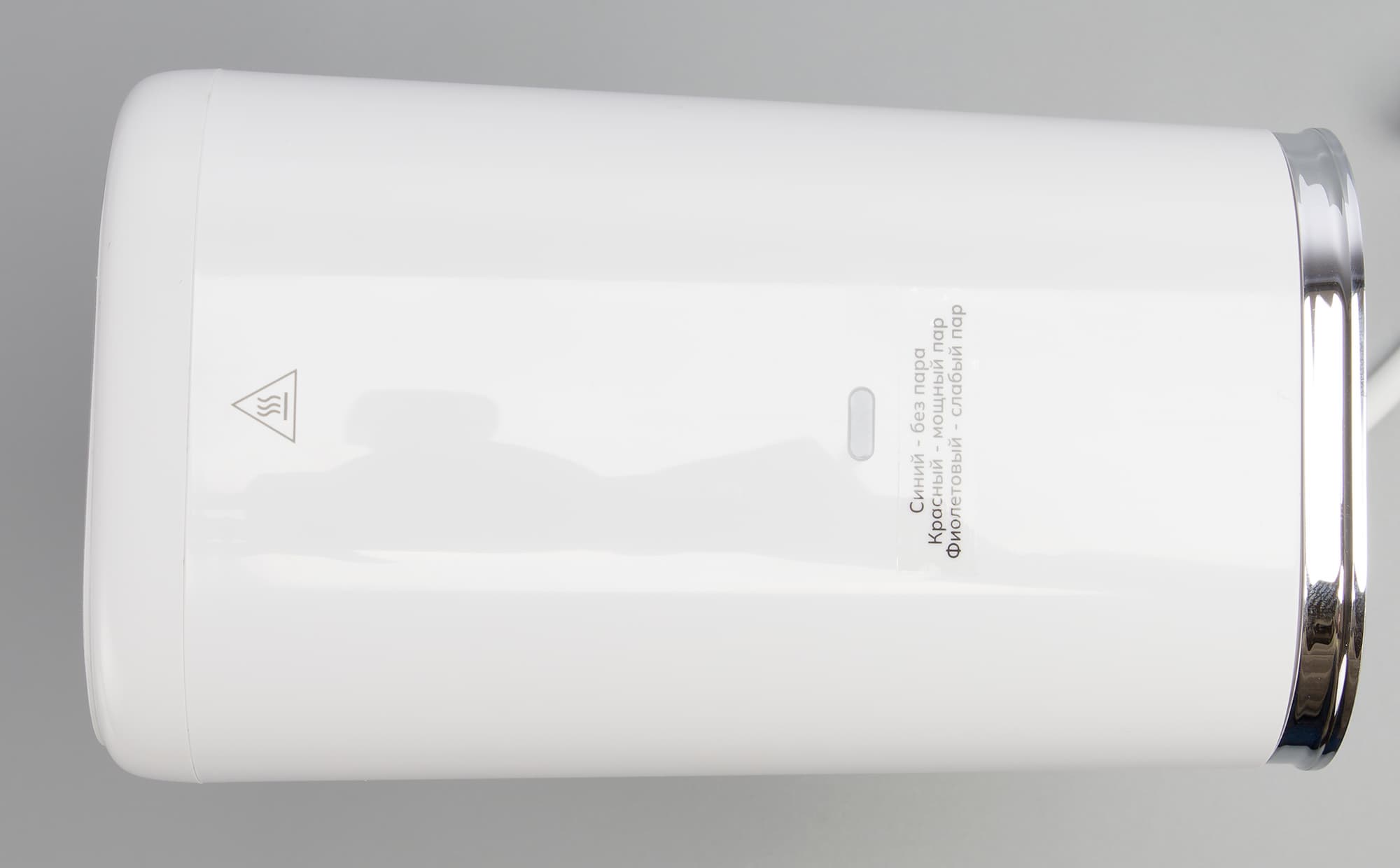 При первом нажатии на кнопку индикатор загорается красным — это максимальная подача пара, при следующем — индикатор подсвечивается фиолетовым и подача пара происходит в умеренном режиме. Третье нажатие отключает пар. При простое индикатор горит синим цветом. Если не отключать пар самостоятельно, при установке устройства обратно на станцию подача пара прекращается автоматически.