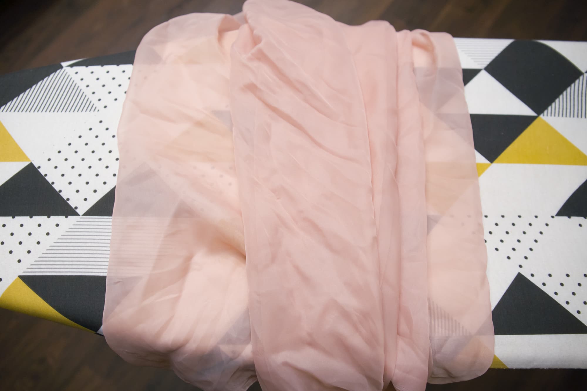 Органза требует деликатного подхода и не любит чрезмерного теплового воздействия. В этом тесте нас интересовало, не испортит ли мощный пар и нагретый утюжок нежный материал. Часть отреза мы обработали вертикально, вторую часть — разложив на доске. В обоих случаях ткань была сложена вдвое, и в каждом из экспериментов мы получили превосходный результат. Мятый материал стал абсолютно гладким и не деформировался.