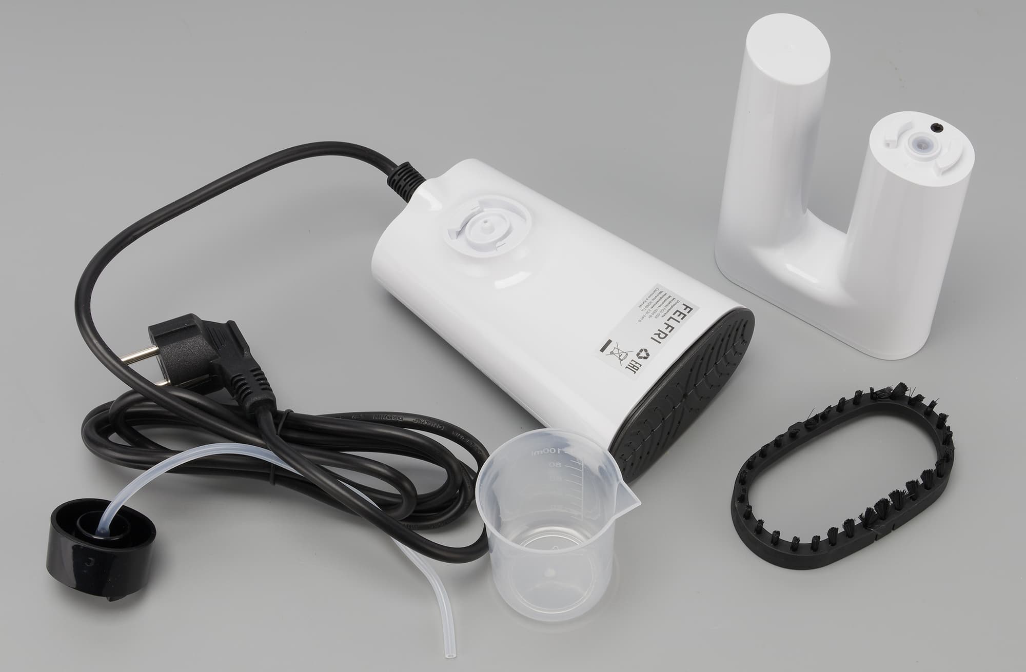 На фото ниже мы видим сам отпариватель, ручку к отпаривателю (она же бойлер) и набор аксессуаров: переходник для установки внешнего резервуара, насадку-щетку и контейнер для заливки воды в отпариватель.