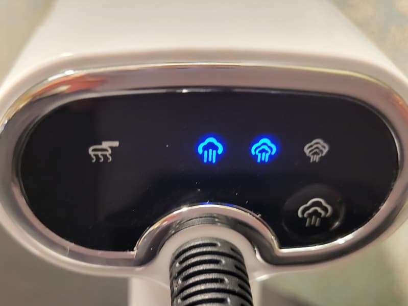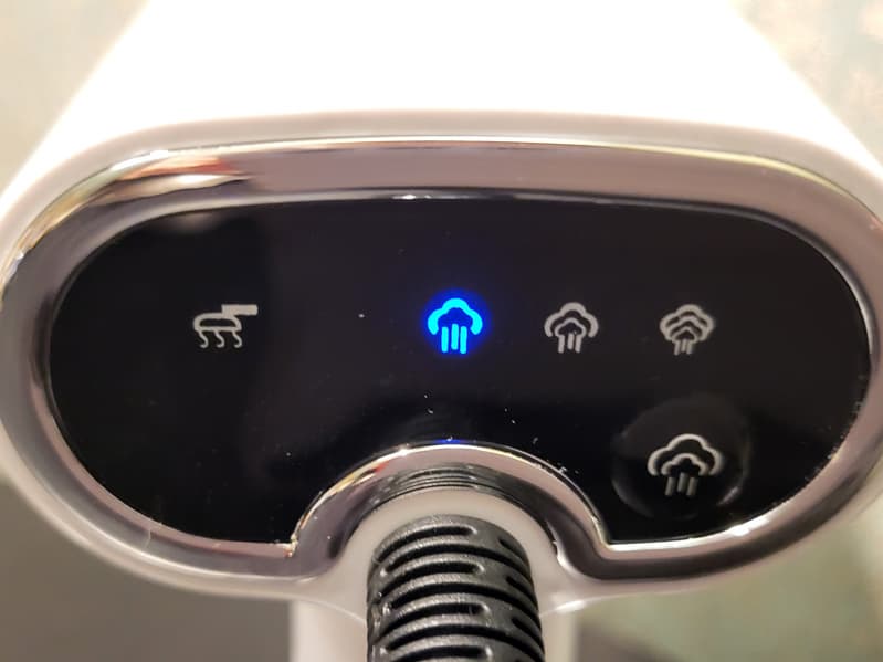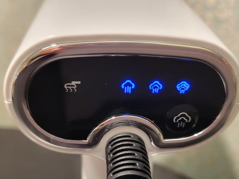 Если нажать на кнопку пара еще раз, загорится синий свет, и далее можно выбрать один из трех режимов подачи пара: максимальный, средний и минимальный.