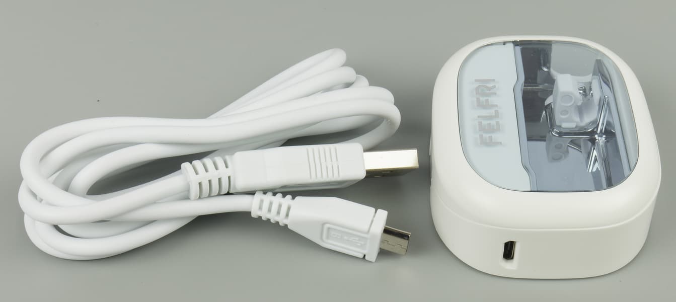 К стерилизатору прилагается зарядный шнур Micro-USB длиной 1 метр и настенное крепление — пластиковая подвесная пластина, которая приклеивается к стене с помощью клейкой бумаги.