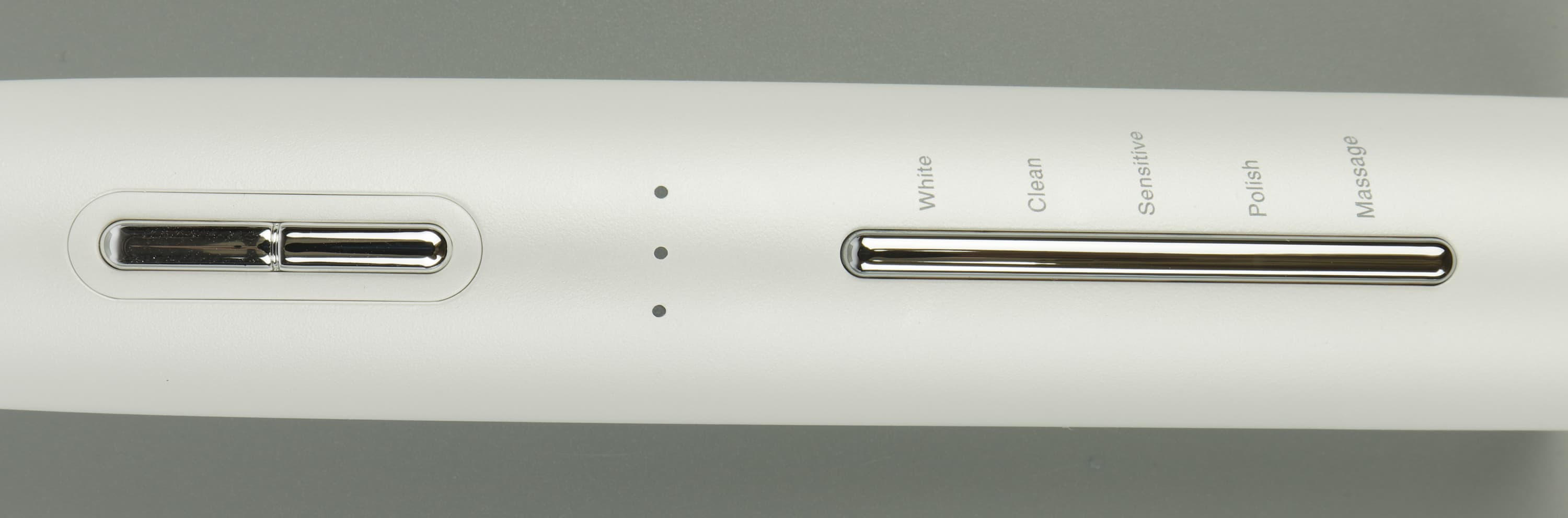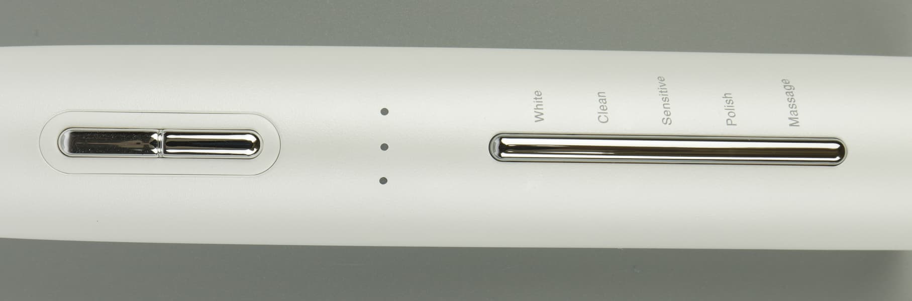 У нашей зубной щетки имеется две кнопки управления. Верхняя отвечает за выбор одного из режимов: