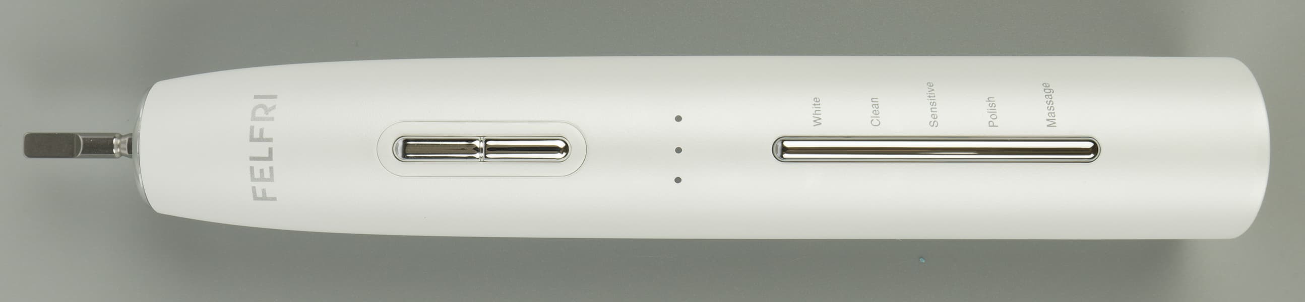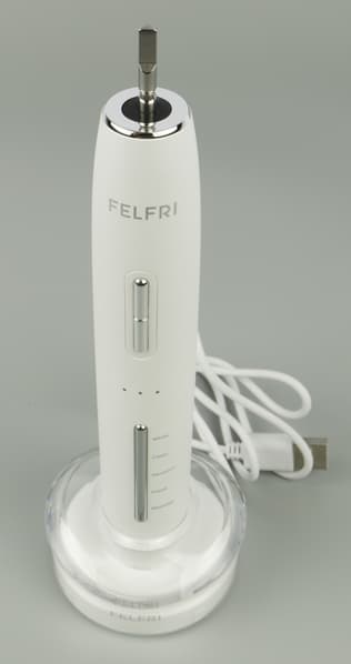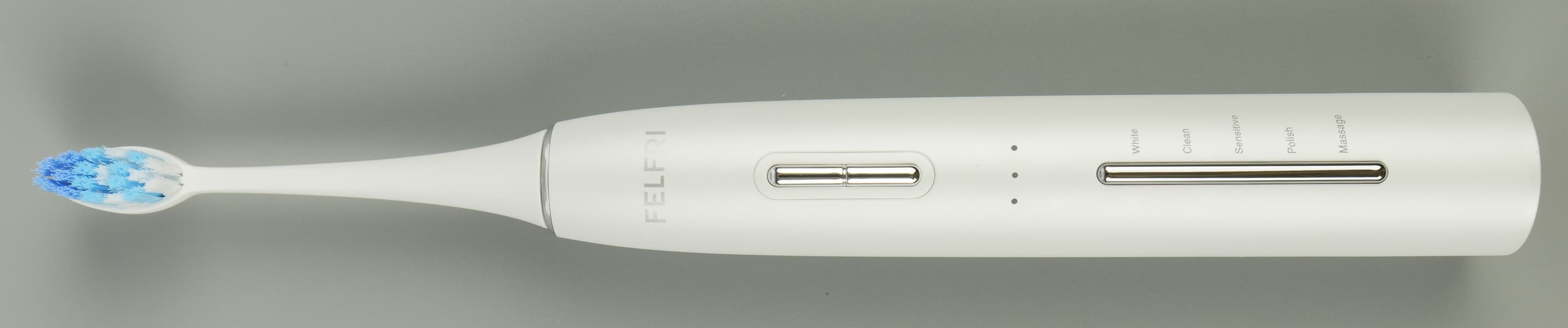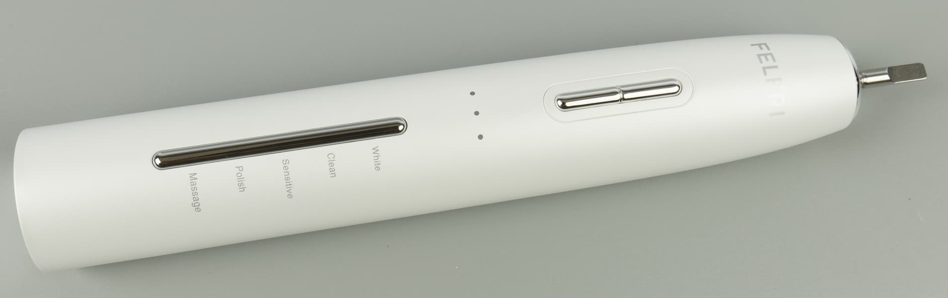 Электрическая зубная щетка Felfri FTB-002 произвела на нас исключительно положительное впечатление. Устройство оказалось вполне симпатичным, простым и удобным в использовании. Большое количество всевозможных режимов позволит подобрать именно тот, который лучше всего подойдет для данного конкретного пользователя. Хотя, конечно, 15 режимов (5 штук с 3 уровнями мощности каждый) — это несколько избыточно. К счастью, щетка автоматически запоминает настройки, поэтому каждый раз щелкать кнопками не придется.