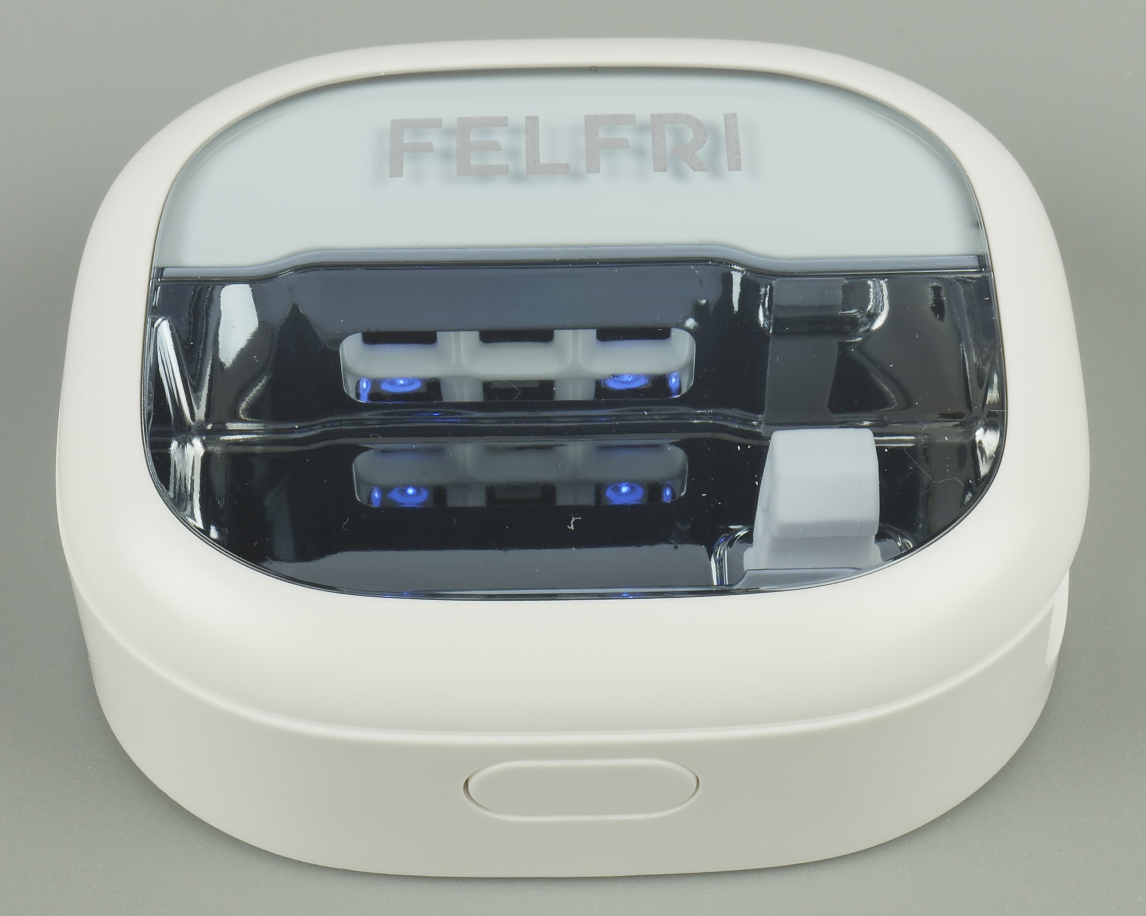 Спереди мы видим две кнопки управления, а под ними — светодиодные индикаторы выбранного режима и мощности. Наверху нанесен логотип Felfri.