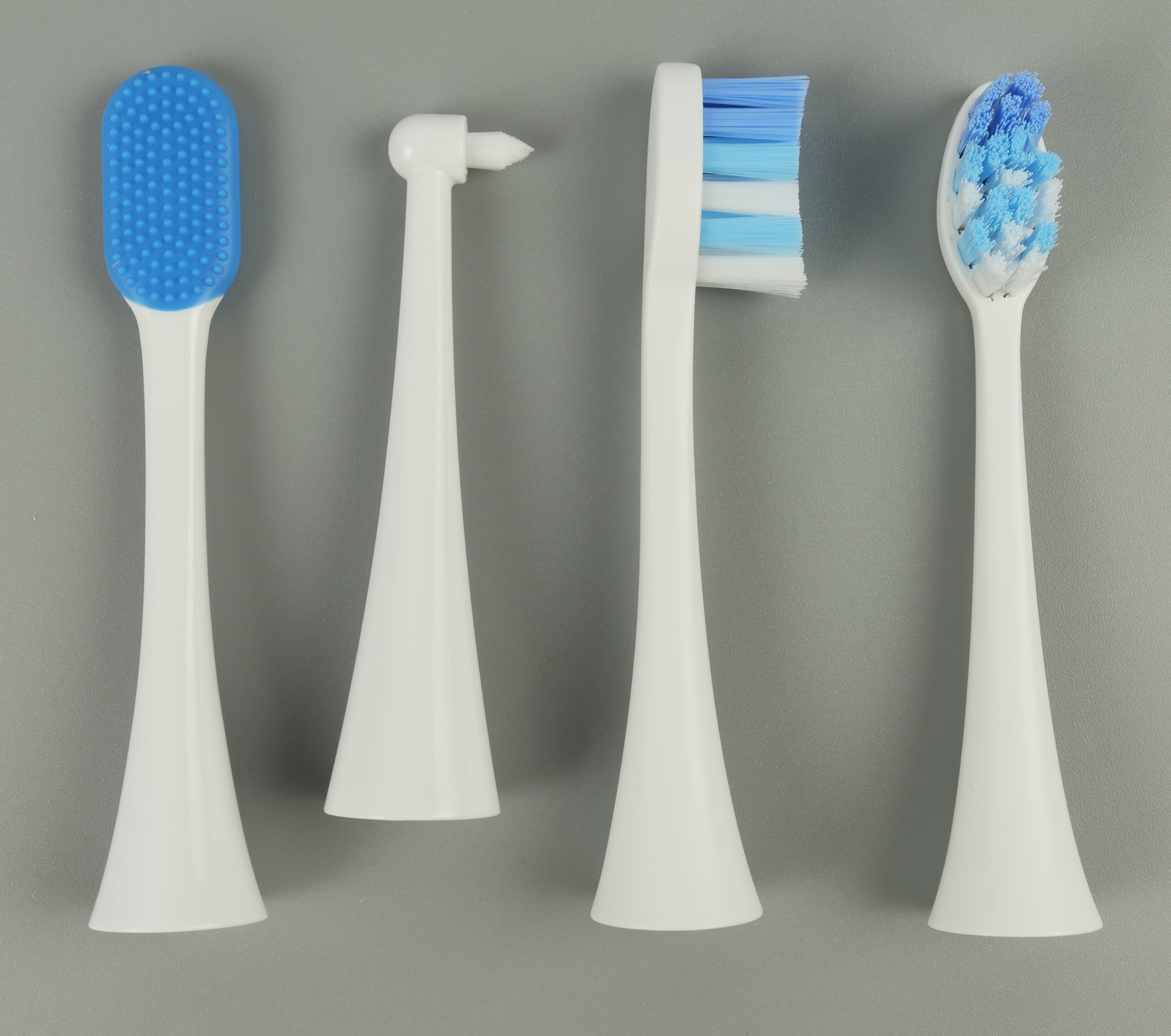В комплекте мы обнаружили две насадки для чистки зубов (как пишет разработчик — щетина Dupont, высшего качества), насадку для межзубной чистки, а также насадку для чистки языка. Выглядят все они стандартно. Щетина, по нашим субъективным оценкам, средней жесткости.