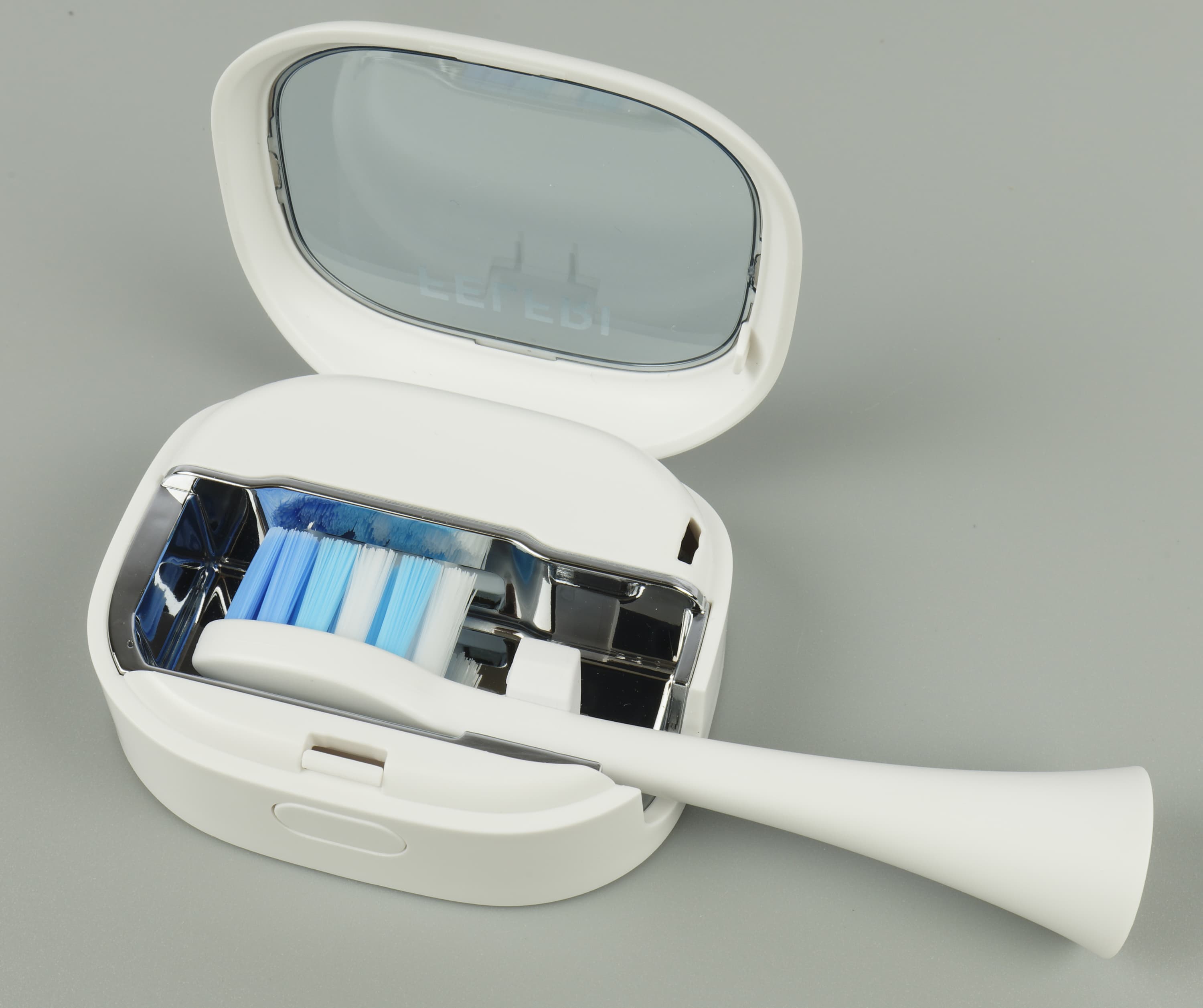 Внутри расположен миниатюрный ультрафиолетовый светодиод, рядом с ним — светодиоды с синей подсветкой, которая включается во время работы стерилизатора. Насадка для щетки крепится внутри с помощью пластиковой защелки.