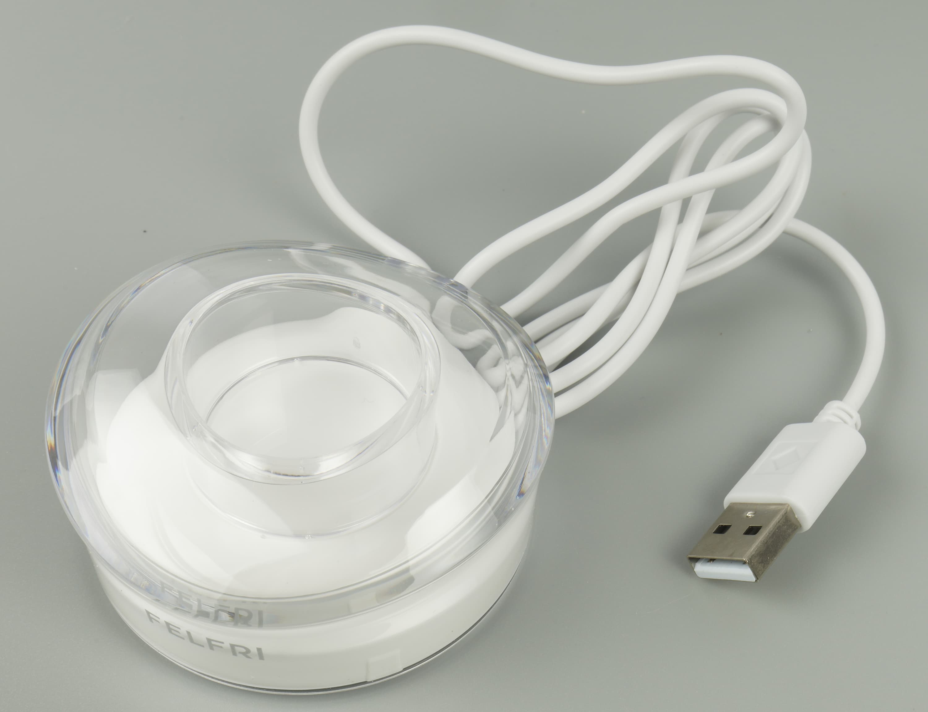 Взглянем теперь на зарядную станцию. Она представляет собой миниатюрную подставку из белого глянцевого пластика. Неотсоединяемый USB-шнур длиной 1 метр можно подключить к любому зарядному устройству, в том числе к автомобильному ЗУ или к ноутбуку. То есть, без заряженной щетки мы не останемся даже во время командировок или поездок. Снизу у зарядной станции имеется резиновый уплотнитель, благодаря которому станция не будет скользить по гладкой поверхности. С нижней стороны мы также видим название модели и технические параметры (вход: DC 5 В, 2,5 Вт).
