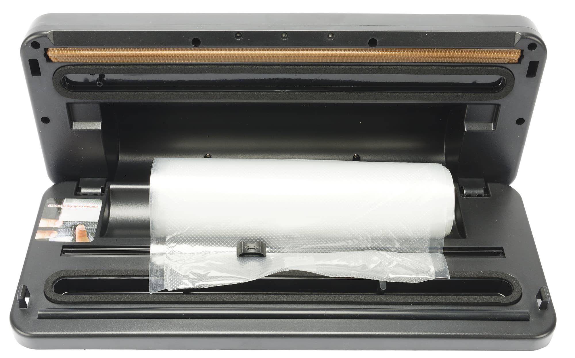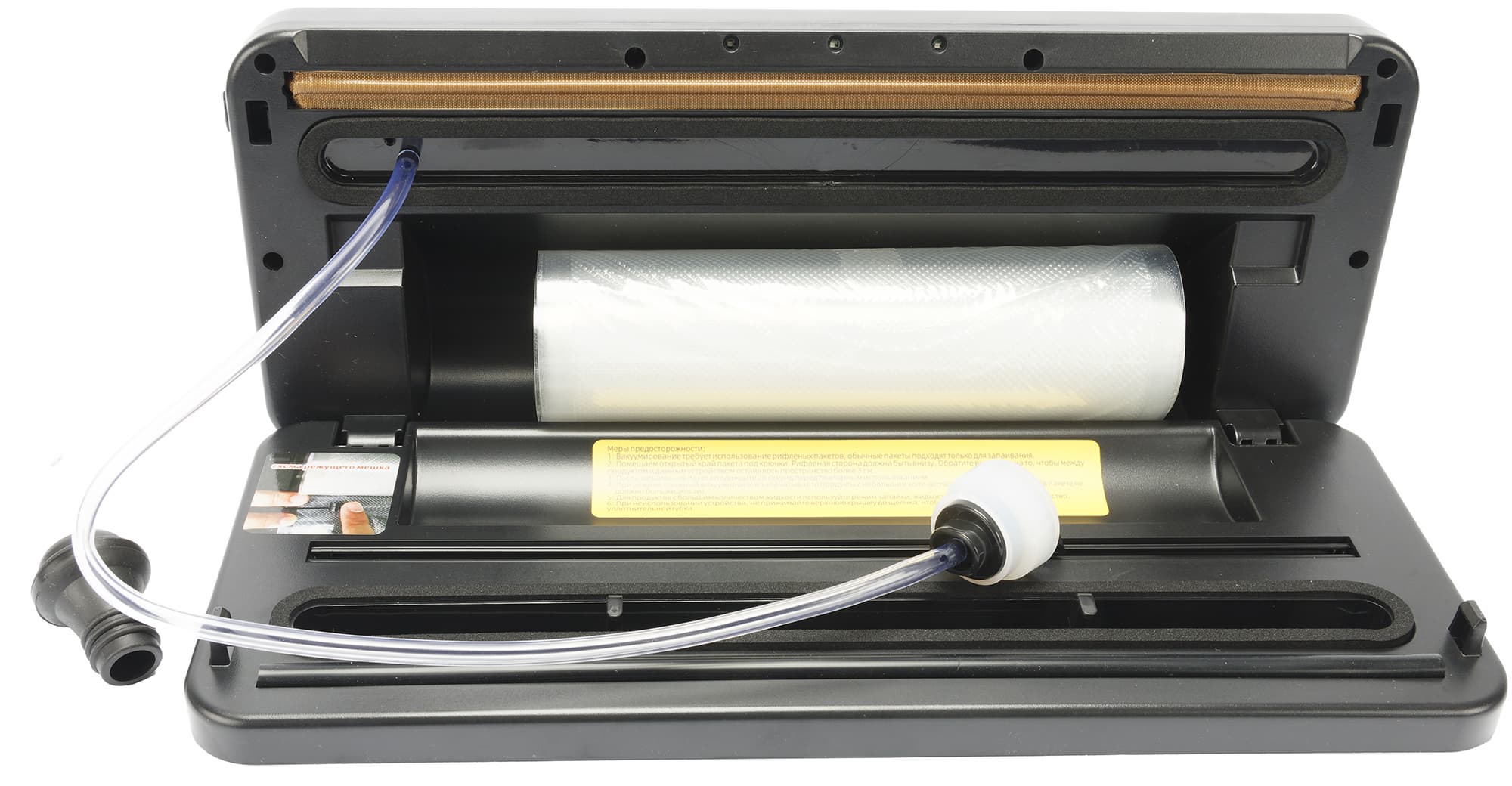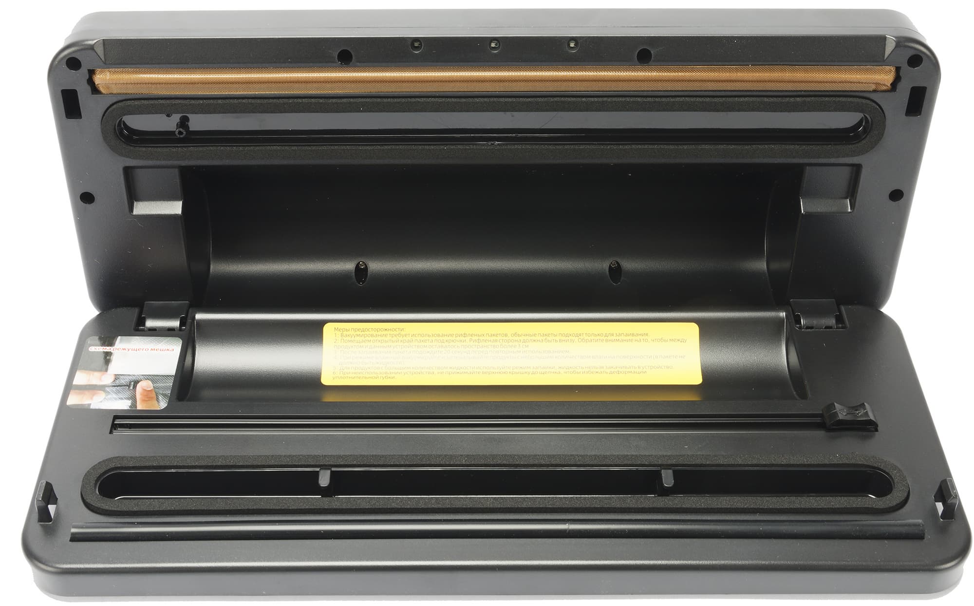 Открыв крышку, мы видим: два вспененных уплотнителя снизу и сверху, поддон для сбора жидкости и отверстие для откачивания воздуха, ближе к внешнему краю — металлический нагревательный элемент с тефлоновым покрытием, а на крышке ровно над ним — прижимной валик из термостойкого материала, похожего на резину.