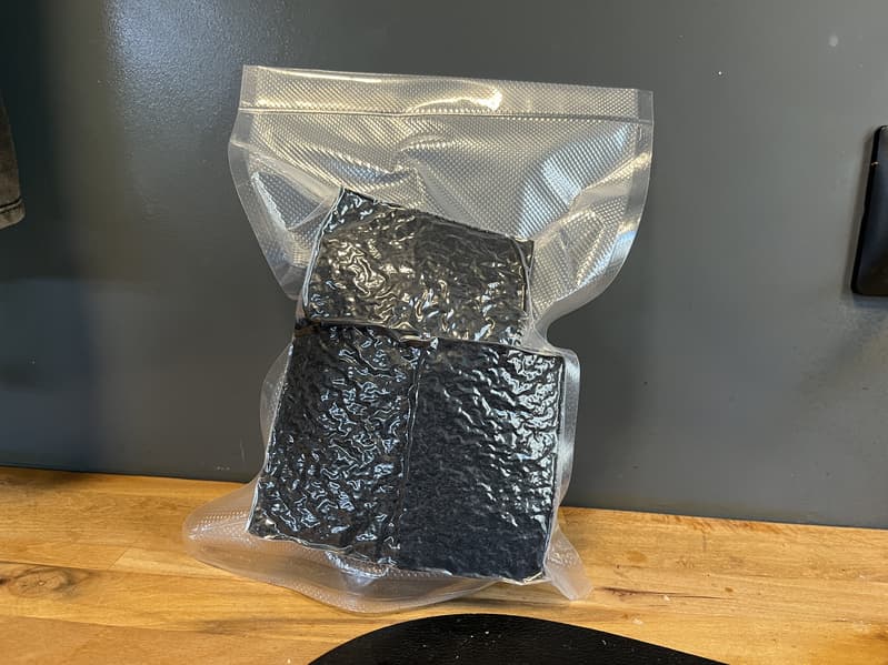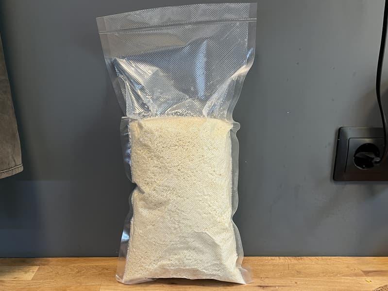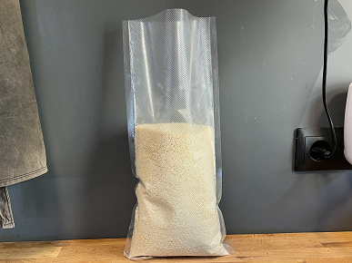 Для такого большого объема продукта мы выбрали рулон-рукав, чтобы отмерить нужный нам размер пакета. Сделали шов на дно, пересыпали сухари и воспользовались выбранным режимом вакуумации.