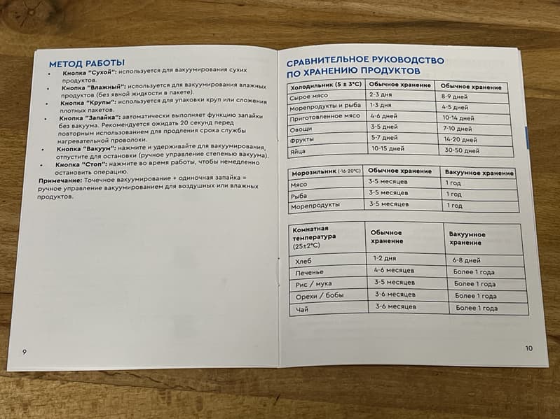 Здесь имеется вся необходимая информация о приборе, его технических характеристиках, правилах эксплуатации и даже таблицы с рекомендациями по времени хранения вакуумированных продуктов.
