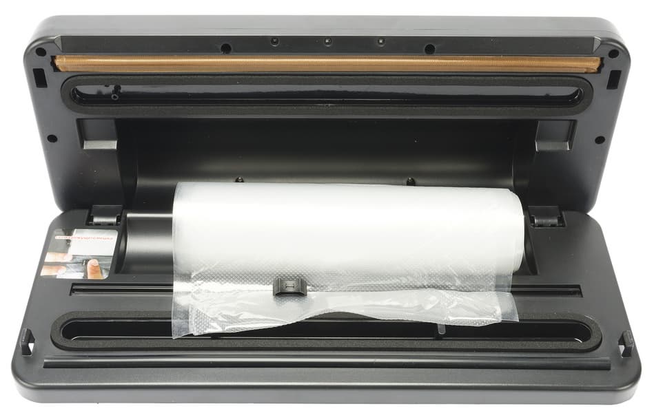 Край пакета вставляется в центральную часть вакуумной камеры при открытой крышке устройства. Затем крышка закрывается — боковые защелки фиксируют ее положение, а легкий нажим до щелчка с обеих сторон обеспечивает плотное прилегание. Из этой позиции можно начинать как запайку, так и вакуумирование, если шов уже имеется.