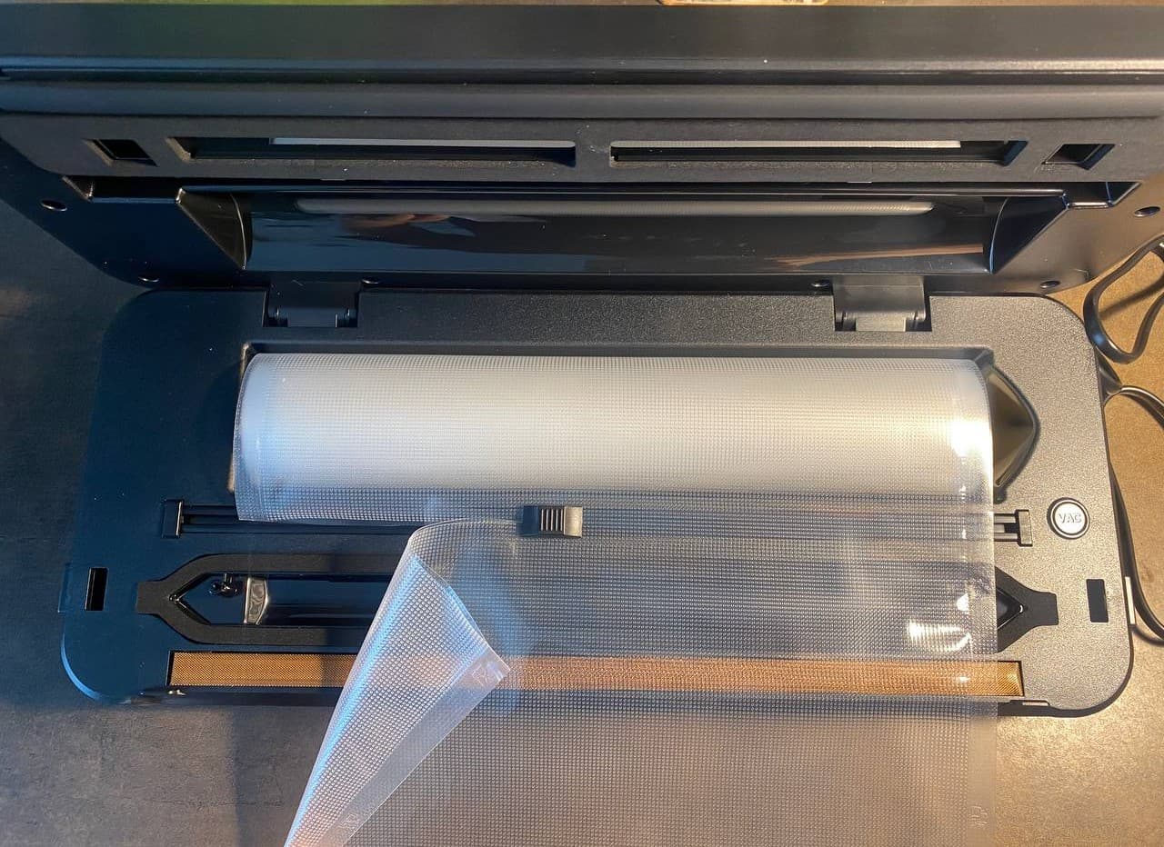 В процессе эксплуатации прибора мы обнаружили для себя полезный лайфхак: можно самостоятельно изготавливать пакеты нужного размера из рулона с пленкой. Всё просто: с помощью встроенного резака отрезаем кусок нужной длины (естественно, ширина пакета будет ограничена шириной рулона), запаиваем один край — и пакет готов к использованию.
