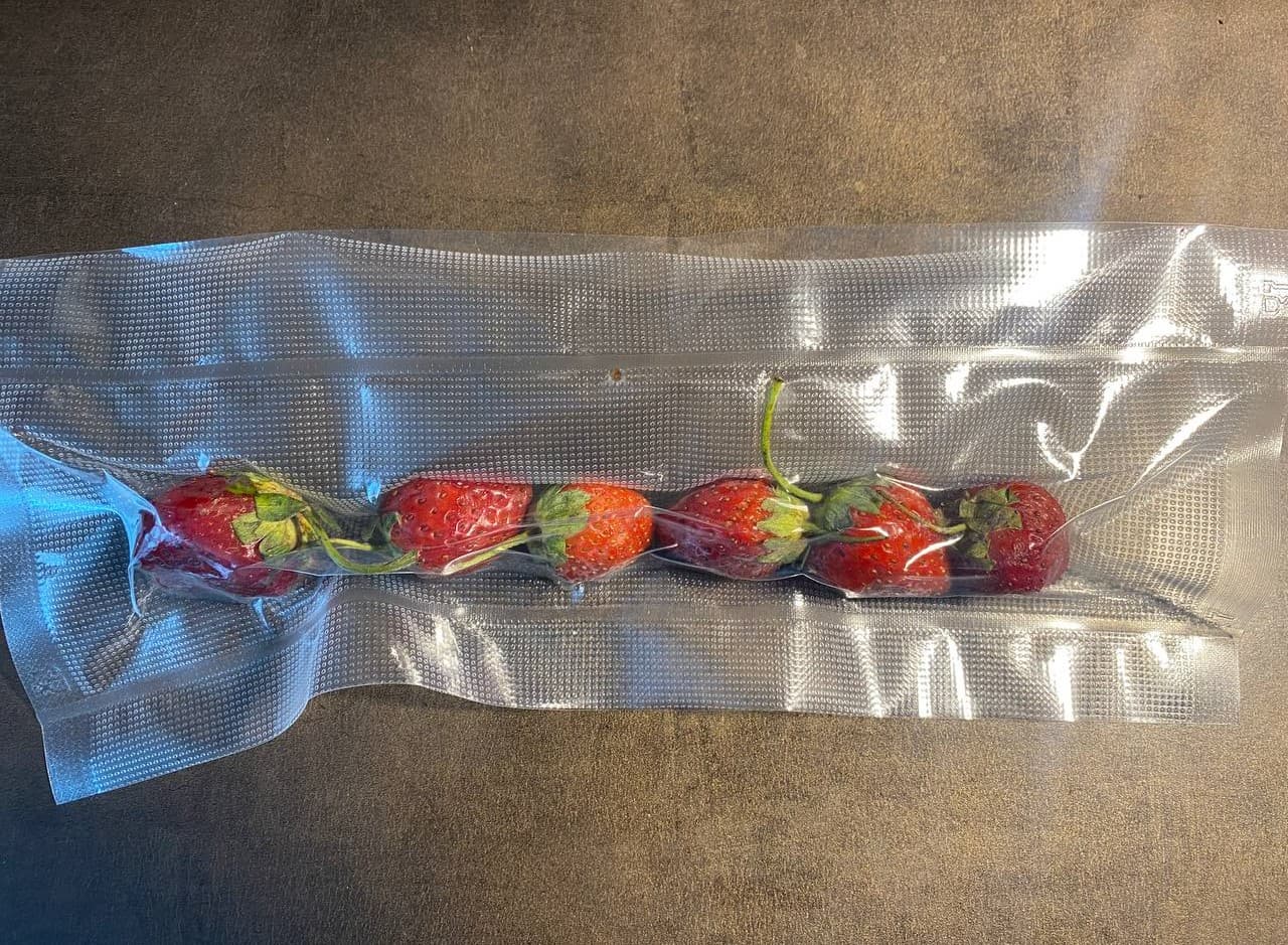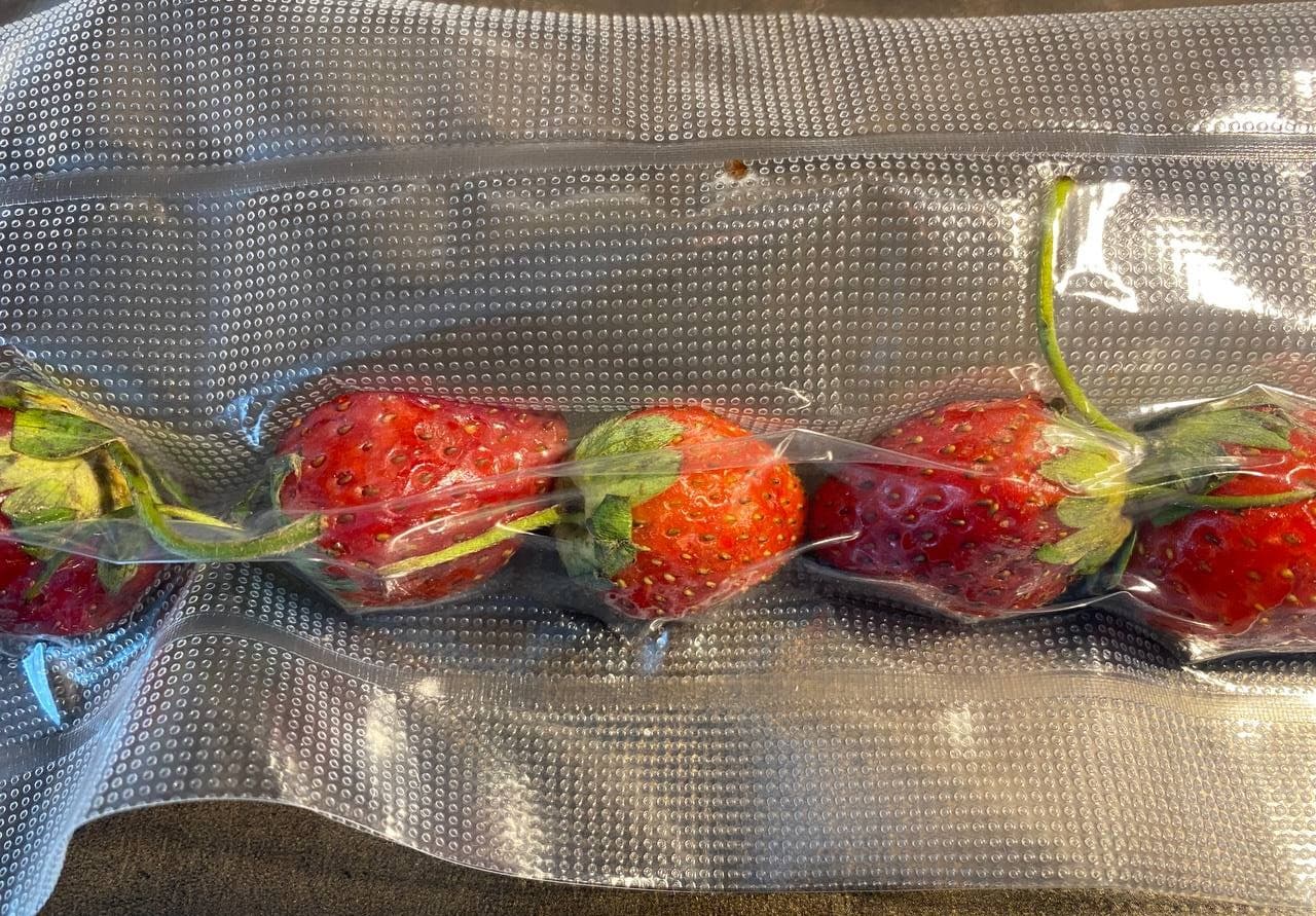 Уложили свежую клубнику в пакет для вакуумирования и загрузили его в устройство. Для контроля процесса выбрали режим «импульс», при котором вакуумирование выполняется вручную, с возможностью остановки в любой момент.