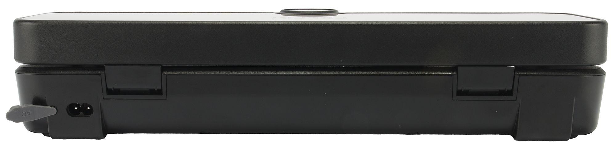 Сзади прибора, слева внизу, находится серая силиконовая подвижная накладка с надписью «ас». Под ней скрыт разъем для подключения блока питания. Такая защита предотвращает попадание пыли и посторонних предметов внутрь разъема, что способствует сохранению работоспособности устройства на долгий срок.