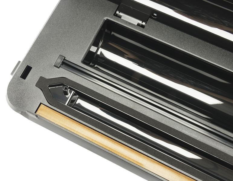 Работа с встроенным резаком требует небольшой внимательности и сноровки. Сначала резак может слегка заедать в начале движения по пленке, и пленку приходится немного плотнее придерживать. Мы сначала думали, что это просто привыкание к новому устройству, но в процессе эксплуатации поняли, что дело именно в начале движения резака. После первых несколько миллиметров резак работает исправно и отрезает пленку без проблем. Этот нюанс не мешает общей работе устройства, но всё же обращает на себя внимание.