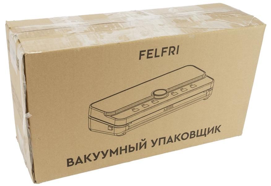 Вакуумный упаковщик Felfri FVP-005 поступил к нам во внешней коробке из прочного коричневого картона, обмотанной скотчем. На ней нанесена черная символика бренда, наименование устройства и его схематичное изображение. Такое оформление свидетельствует о заботе производителя: уже на этапе логистики товар надежно защищен от повреждений. Деталь вроде бы незначительная, но она говорит о серьезном подходе к качеству доставки.
