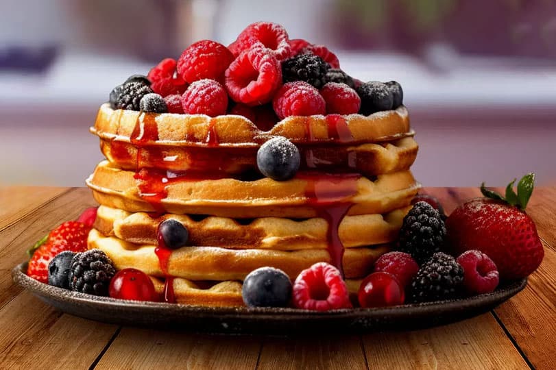 Для подачи на стол мы украсили вафли малиновым вареньем и взбитыми сливками. Получился идеальный завтрак за очень малое время на кухне.